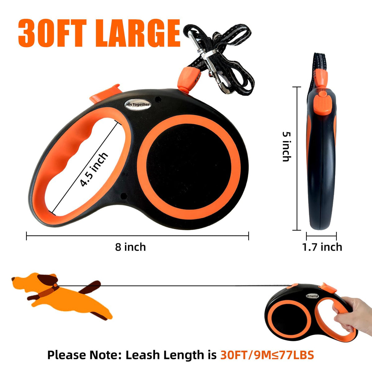 Upgraded Design New Orange&Black Color. Reflective Materials. Highly Reflective Cord Leash Increase Security & Visibility For Dogs And Their Owners Early In The Morning Or Late At Night. 360 Tangle-Free Design Make The Retraction More Easy And Smoothly. Ergonomic Tpe Anti-Slip Handle We Designed A Larger Area Of The Non-Slip Handle, More Ergonomic Tpe Non-Slip Handle For Easy Grip, Provides Enjoyable Walking Experience With Your Pets And You Don'T Worry About The Dog Leash Will Hurt Your Hand When The Dog Runs Fast. Allow Your Dog More Freedom To Explore While Keeping Control. Cautions: The Retractable Dog Leash Should Not Be Used By Children. Do Not Try To Open The Plastic Casing Or Disassemble Any Other Parts, The Spring Inside May Cause Unexpected Injuries. Do Not Hold Or Grab The Tape And Do Not Allow The Tape To Become Wrapped Around Parts Of The Body, You May Get Hurt. The Dog May Bite The Belt When The First Time You Use The Product, Which Is Normal. So Please Pay Attention To It And Avoid The Damage Caused By Dog Biting Or Sharp Items.