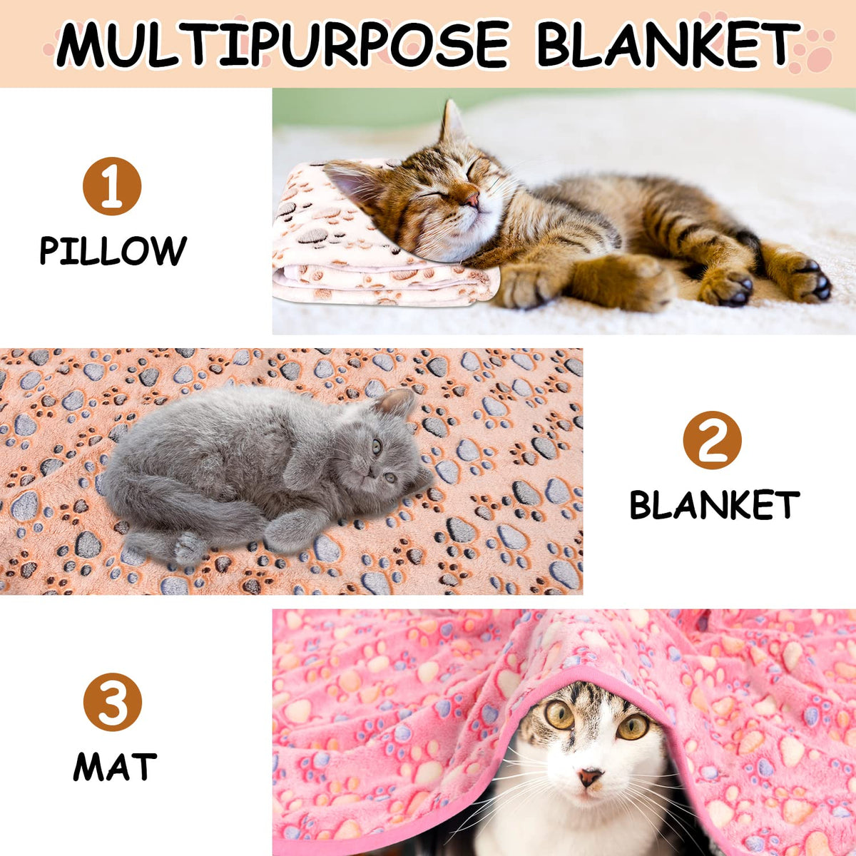 Blankets Sizeor Medium dogs:A:50x60In(130*150cm)B:40x50In(100*130cm)c:42x32In(110*80cm)For small dogs:32x24In(80*60cm)24x20In(50*60cm) Our dog throw blankets whether for dog blankets for small dogs dog blankets for medium dogs dog blankets for large dogs cats guinea pigs lizards you get it our Blanket is purrfect for all shapes sizes & types of petsPlease make sure the blanket size is big enough for your pets before purchase Blanket Fabricremium double-sided 100% fleece flannel blankets You can get velvet and bright blankets in three different colors cute and durable flannel blankets super soft and furry to touch can effectively care catAs and dogAs skin Additionally putting a warm blanket over dog bed or kennel would get our hyperactive pets calm and anxiety relief and to have a good sleep ulti-Purpose BlanketThe lightweight dog blankets are for indoor and outdoor use Providing a comfortable space for our cute dog or cat at any place like crate car seat couch sofa picnic spot camping travel Portable and in good warmth and well absorbent(can absorb slobber water and urine not reverse osmosis help pets stay dry & cozy which makes it suitable for all seasons It keeps our pets from catching cold even in winter or in air-conditioned rooms in summer Easy to care Pet blanket prevent pets fur from falling into furniture which makes your house clean and tidy and pet hairs on the blankets can be easily shaken offOur pet blankets for dogs perfectly blend comfort and style to ensure messes and stains are a thing of the past You can now focus on snuggling with your furbaby instead of struggling with the stain remover TipsOur packing adopts vacuum packing ensure the blanket intact during transit When you unzipped the expected blanket you may feel not well for the blanket looks rumpled thats because our blankets adopt vacuum packaging in order to avoid any damage during the transportationWhat you need to do is to stretch it and it would be looked wellWe provide 1-month return and replacement service & life-time free customer service Any problems about the dog Blankets please feel free to contact us