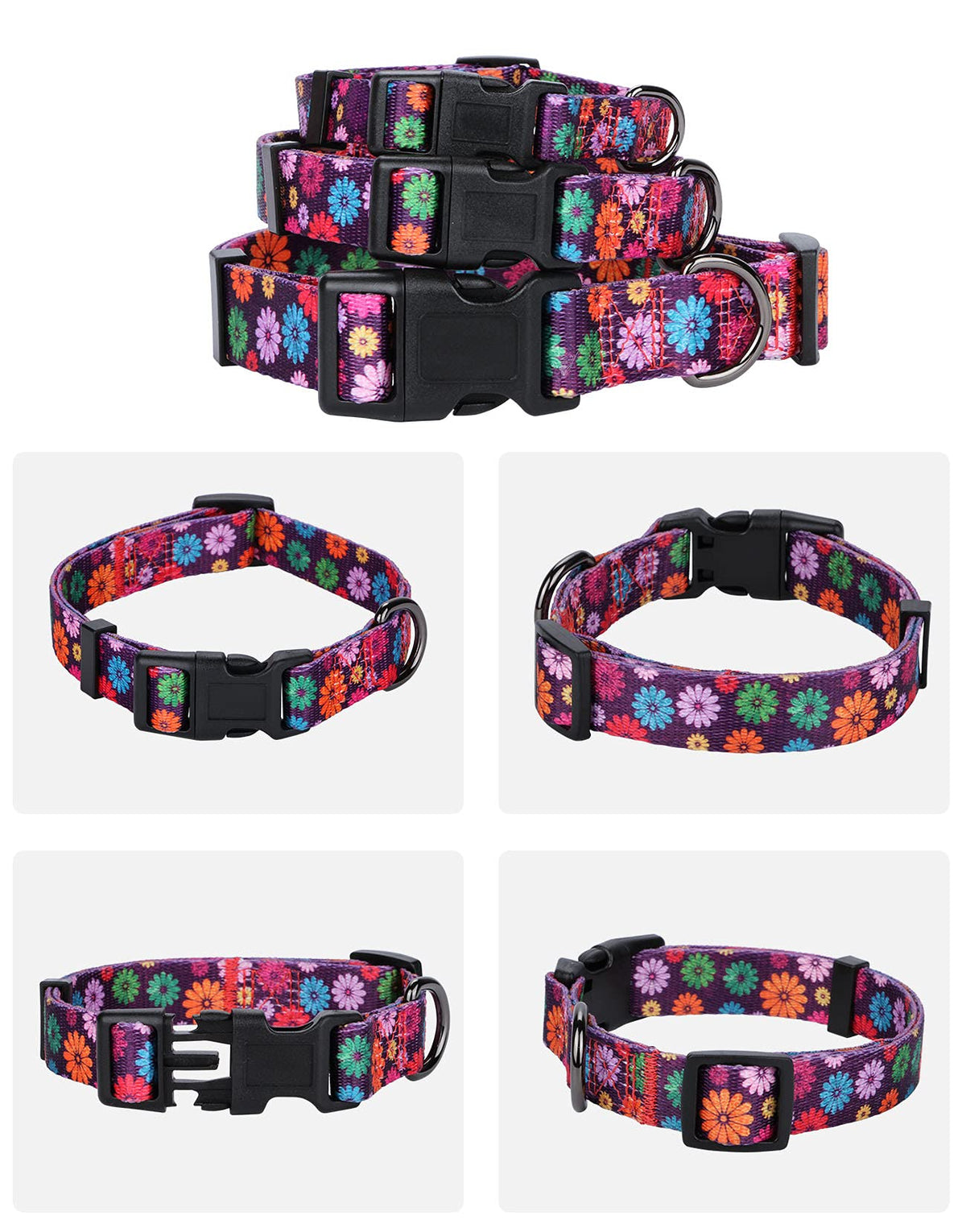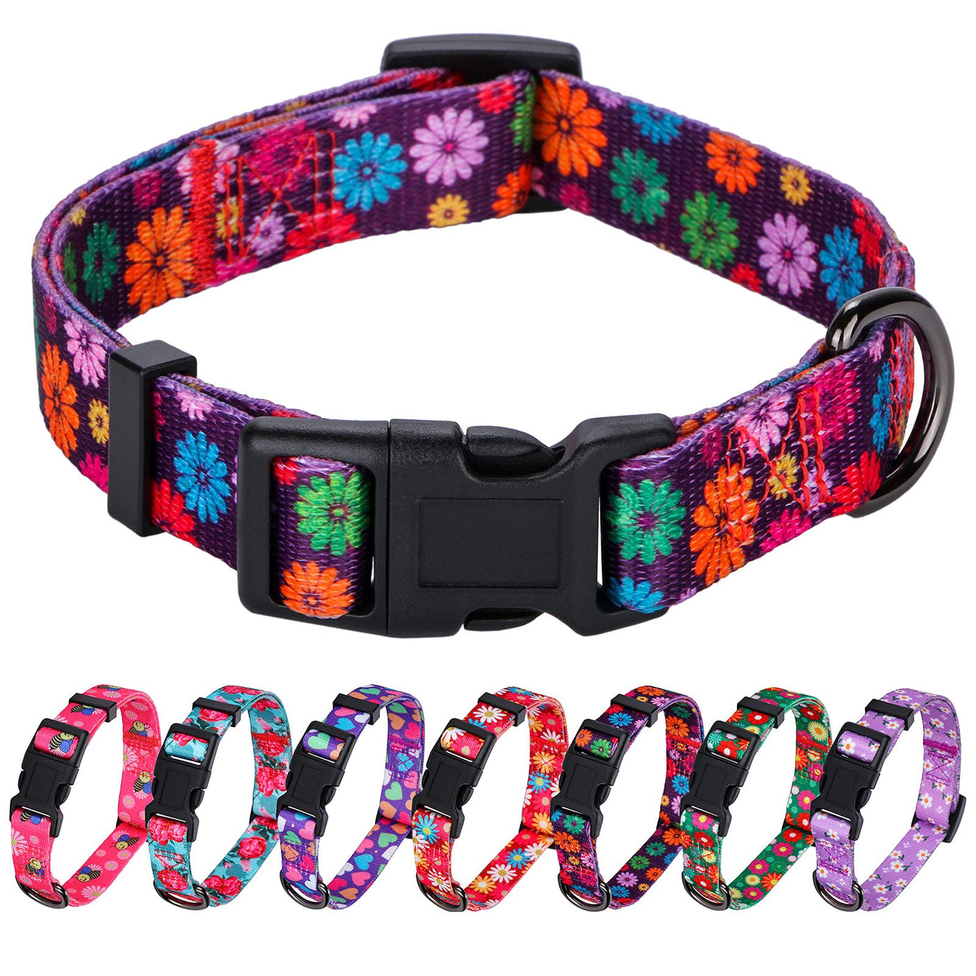 Rhea Rose Girl Dog Collars Fall Daisy Pattern, Colorful Flowers Print, Female Collar, Dark Purple, Large