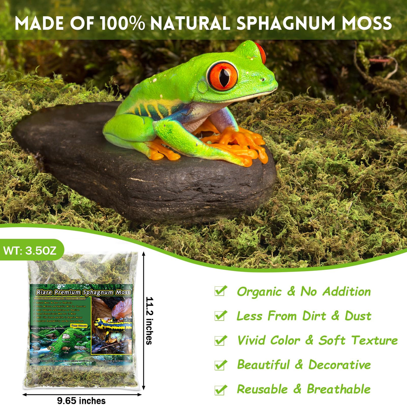 Riare 3.5 OZ Premium Sphagnum Moss for Reptiles- 4QT Natural Live Moss Reptile Moss Bedding for Terrarium, Hatching, Forest Spha