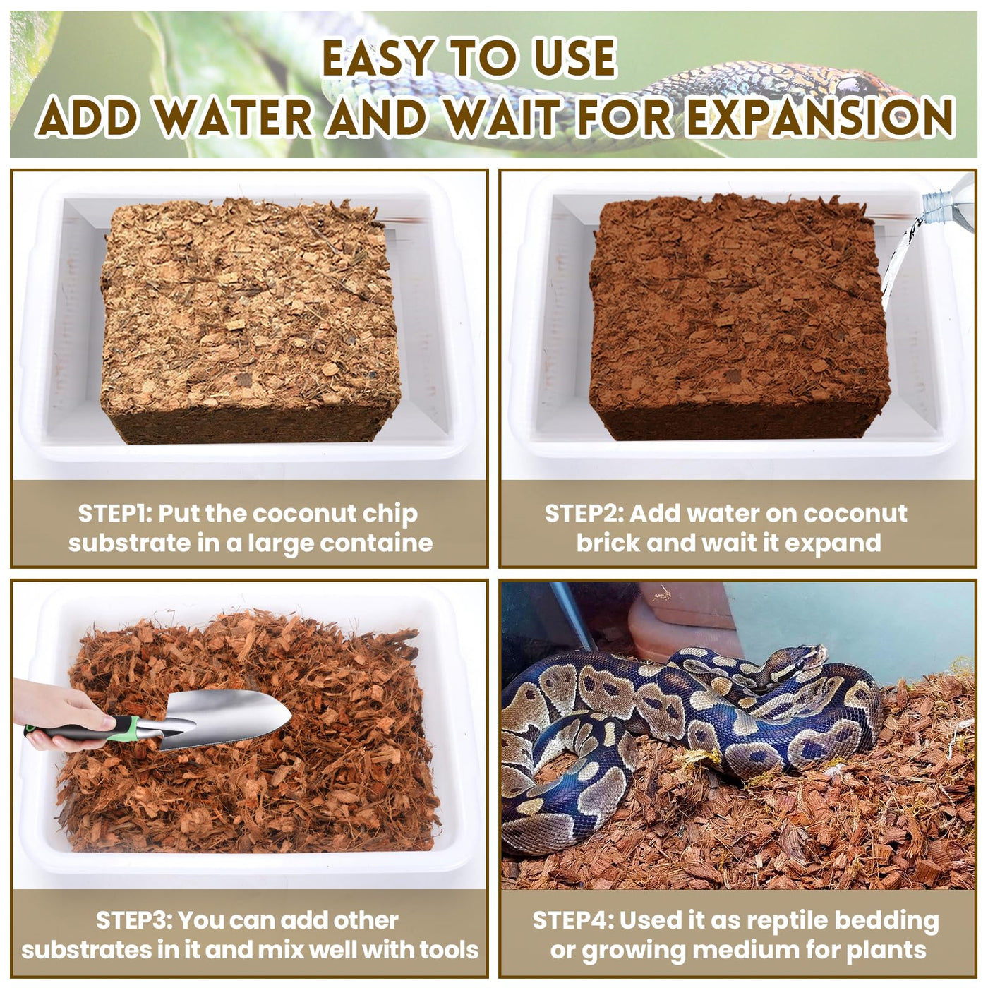 ?Easy to Use & Disposal?Simple to use just add water and wait for it to expand squeeze out the excess water and you're ready to go! Our coconut substrate chips have super odour and dirt-absorbing abilities which effectively breaks down odors and waste. It not only safe for animals also can throw it directly in the garden to compost for growing flowers vegetables and fruits.