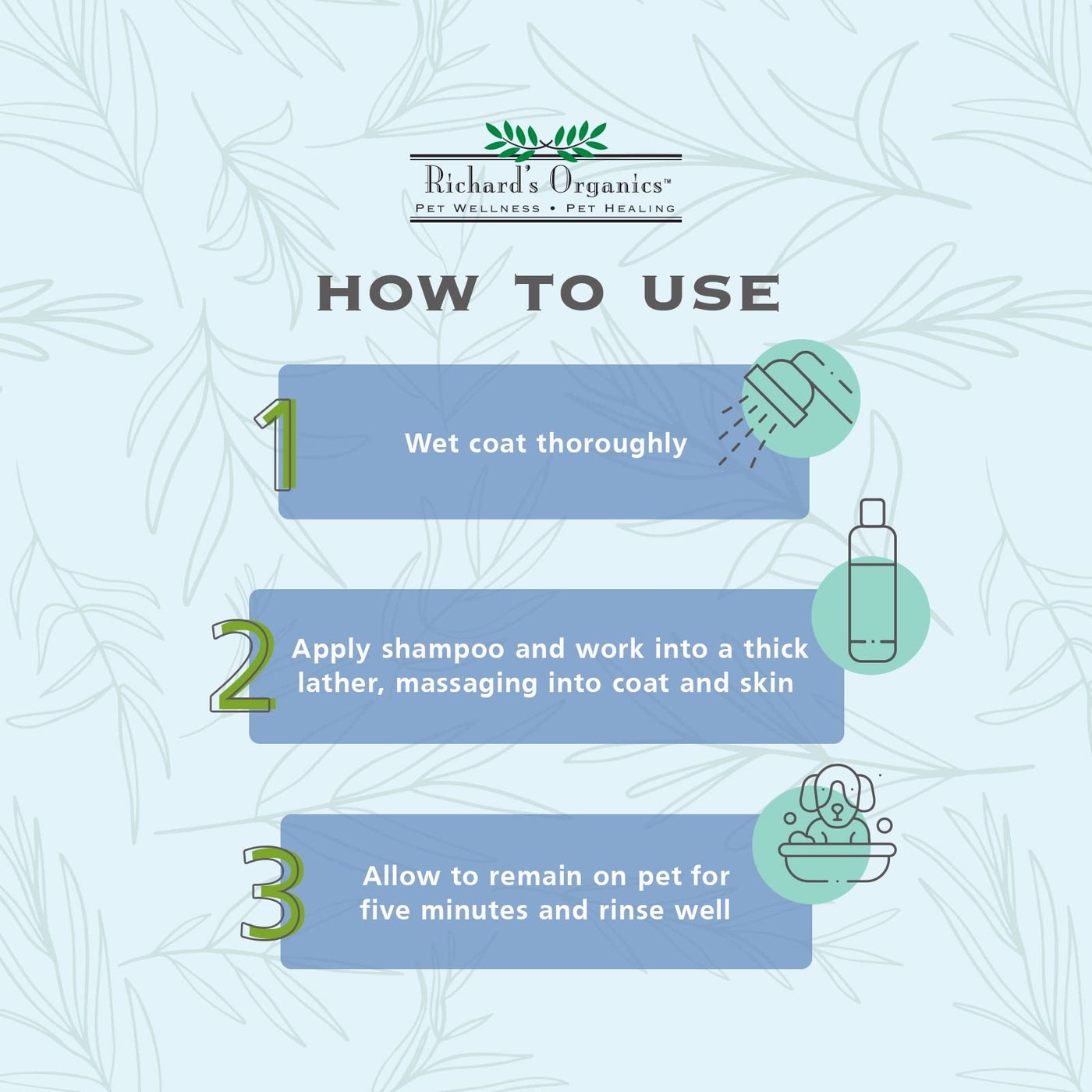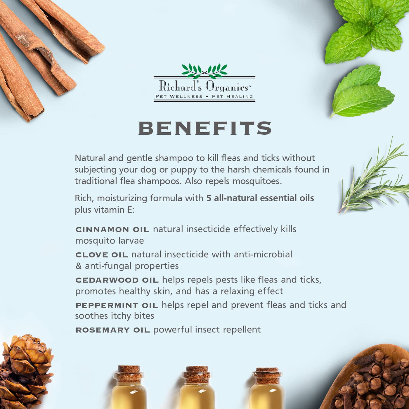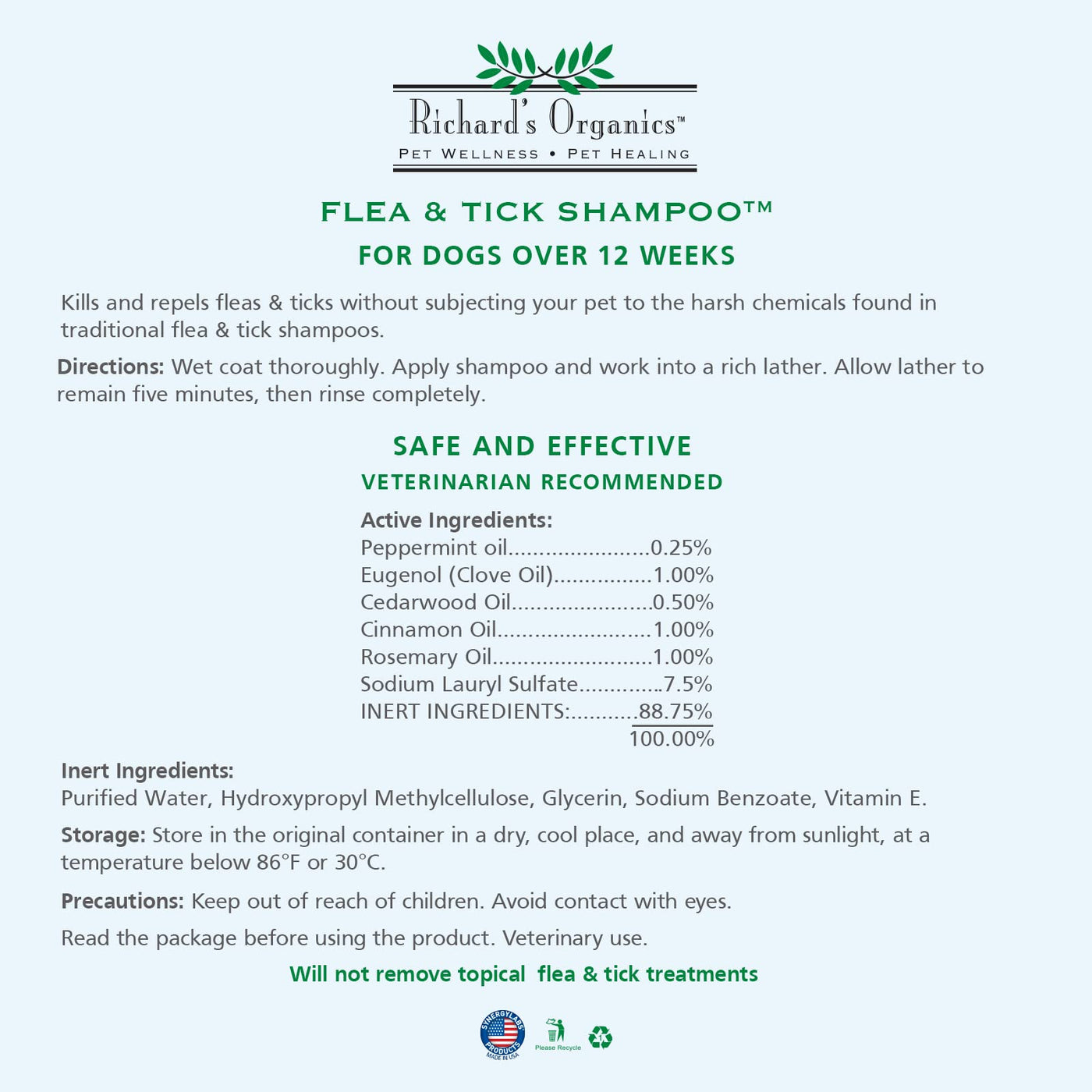 Finding an effective treatment for fleas and ticks in dogs can take many expensive treatments and numerous bottles of ineffective flea shampoo often with harsh chemicals, with no end in sight to your pets discomfort. Not anymore. Richards Organics Flea and Tick Dog Shampoo naturally kills fleas and ticks, repels mosquitos, and soothes irritated skin, with ingredients including five essential oils and Vitamin E. The 100% natural actives ingredients in our topical 12 oz. bottle of Flea and Tick Dog Shampoo is proven to kill fleas and ticks naturally. Cinnamon, Clove, Cedarwood, Peppermint and Rosemary oils, and soothing moisturizers Vitamin E, Lanolin and Lecithin combine to rid your dog of fleas and ticks and soothe irritated skin from excessive scratching, licking and biting. The shampoo is safe for use on dogs over 12 weeks old, paraben, dye and soap free, does contain any harsh chemicals or artificial fragrances, and is great for dogs with sensitive skin. You can also use it with other topical spot-on flea and tick treatments. For best results, work the lather thoroughly into the dogs coat and down into the skin, moving back from the head. Allow lather to remain on the dog for a few minutes and then rinse. You will actually see the fleas coming off your dog as you bathe with Richards Organics Flea and Tick Shampoo. We know that your dogs are more than just pets - they are part of the family - so Richards Organics designs premium wellness and healing products that pet parents can actually afford. Your dog will be free of fleas and ticks, smell great and irritated skin will heal with natural ingredients rather than harsh chemicals - making you both happy and able to focus on more important things like walks, fetch and snuggles. Of course, if skin issues become a consistent problem, please consult your veterinarian. Due to the active oil ingredients of this shampoo, it is not safe to use on cats.