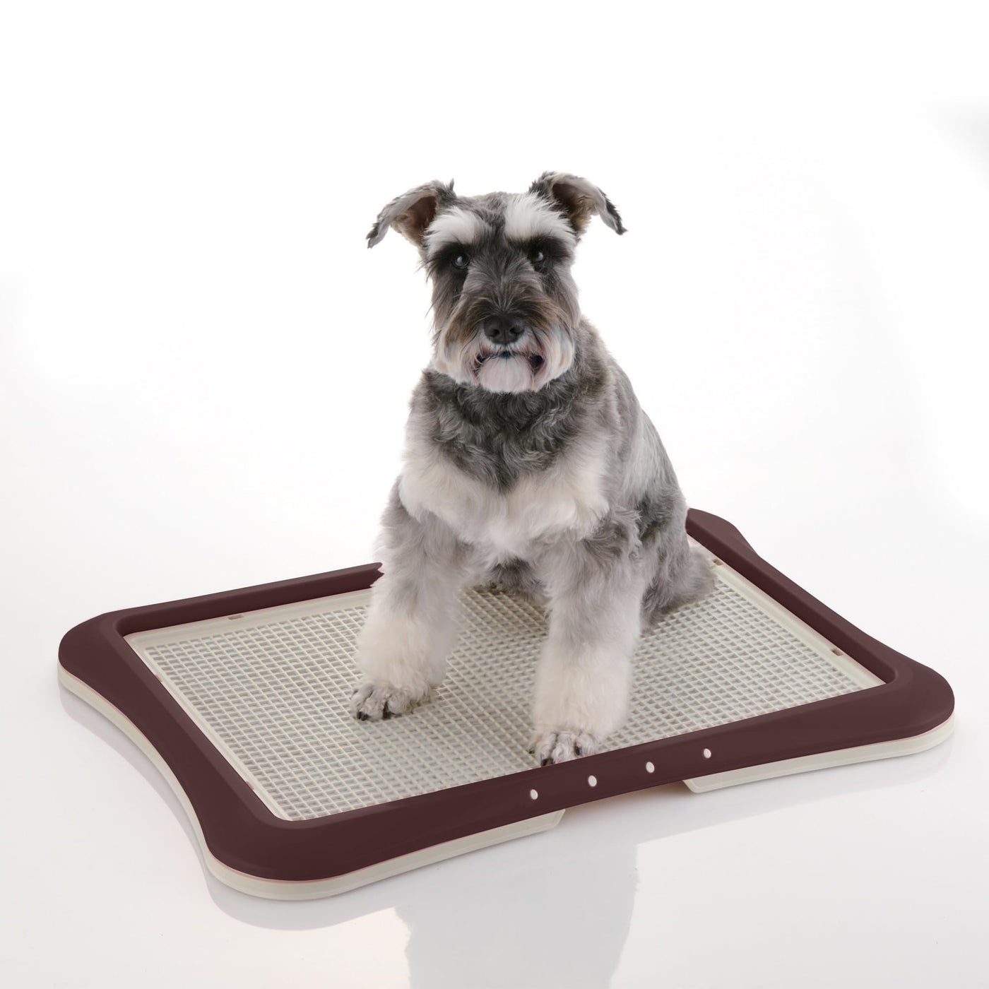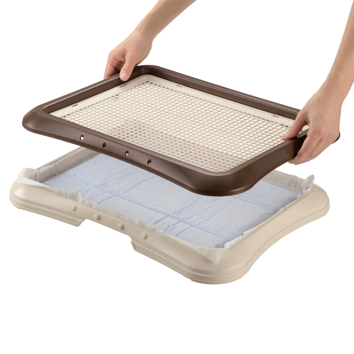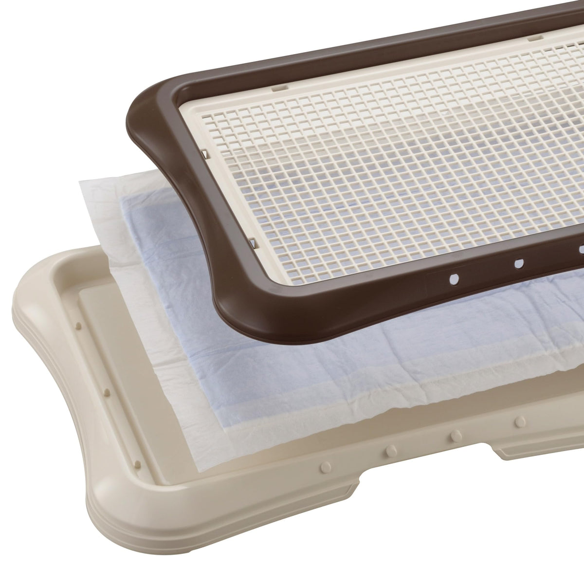 PAW TRAX® MESH PUPPY POTTY TRAY - BROWN - Say goodbye to accidents and streamline potty training with Richell's PAW TRAX® Mesh Puppy Potty Tray. Specifically designed for use with PAW TRAX® Super Absorbent Doggy Pads (Pad size: 17.7 x 23.6'), this tray offers superior protection to floor surfaces. The snap-in frame securely holds the doggy pad in place, while the snap-in mesh top prevents dogs from chewing the pads, ensuring their durability. Ideal for both puppies and older dogs, this tray is a convenient solution for potty training and accident prevention. Take it with you while traveling for a portable potty area wherever you go. Enjoy hassle-free potty training and keep your floors clean with Richell's PAW TRAX® Mesh Puppy Potty Tray. Item Dimensions: 25.2 x 18.9 x 1.6 inches. Accommodates pads size: 17.7 x 23.6 inches (60 x 45 centimeters).