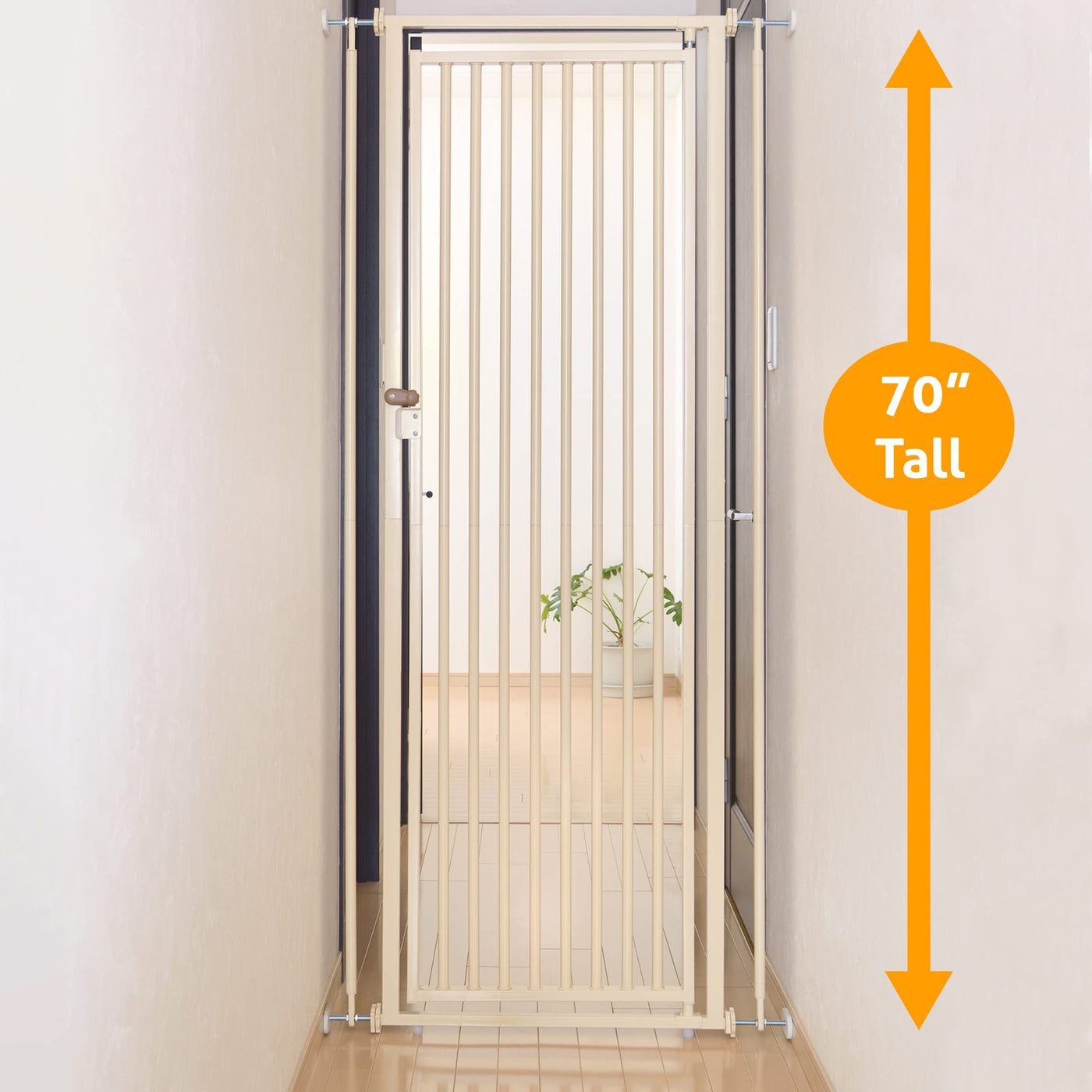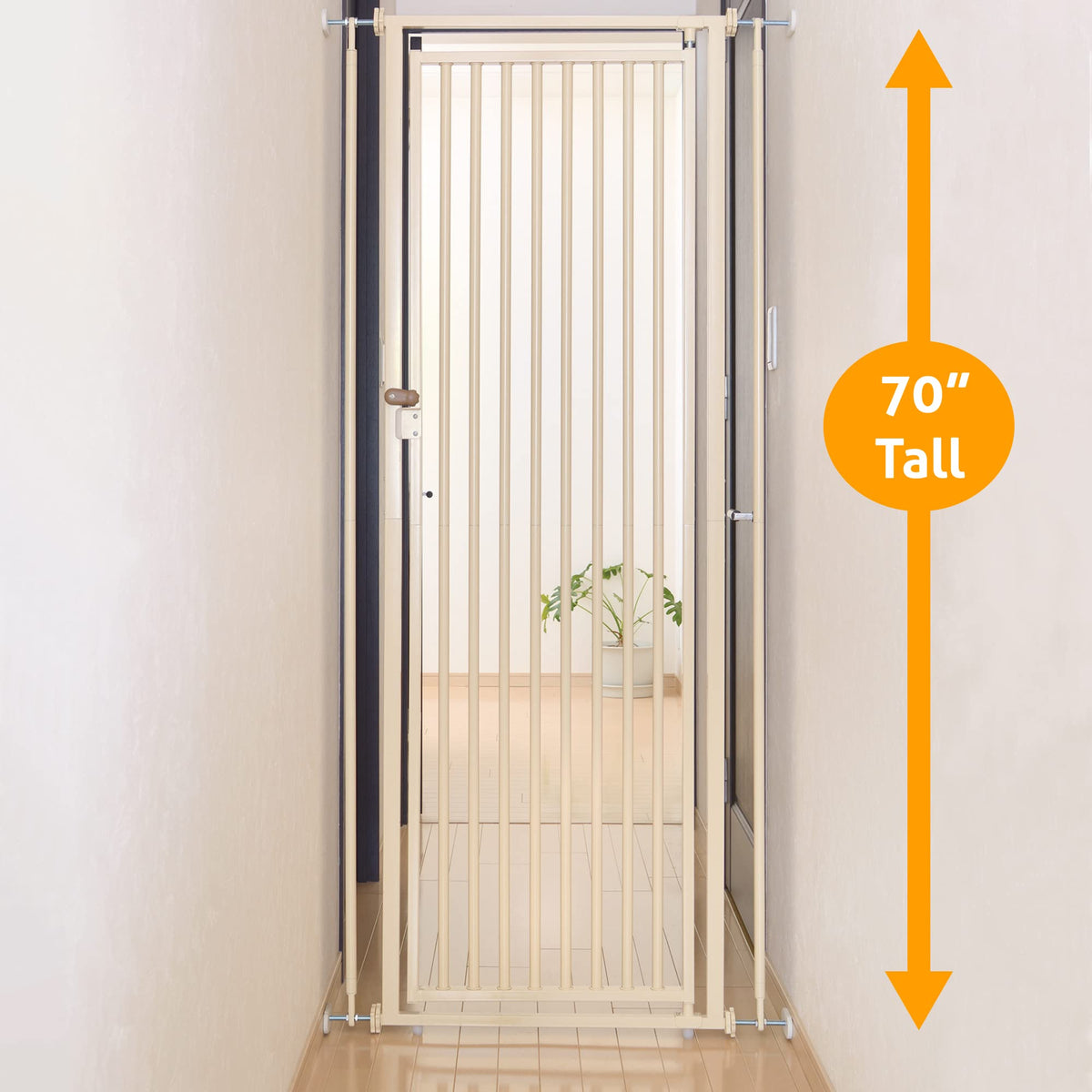 The Richell Cat Safety Gate gives cat parents peace of mind by keeping cats safe and sound in whatever space you need to contain them. This 70 extra tall Cat Safety Gate is designed to fit common dimensions of hallways or doors. The gate is tension mounted, designed to fit openings that are 28 - 37.5 wide, and is made with durability in mind (all-steel construction). Each pole is rounded and has a narrow gap to keep cats from climbing, jumping over, or squeezing through the gate. The door opens one way to prevent cats from escaping the interior if left unlocked. Turn the PAW shaped lock to open and close the door. A block plate is located on the reverse side of the lock to protect from any curious paws looking to open the door. Gate includes rubber feet to protect floor surfaces from scratches. Recommended for cats up to 11 lbs.