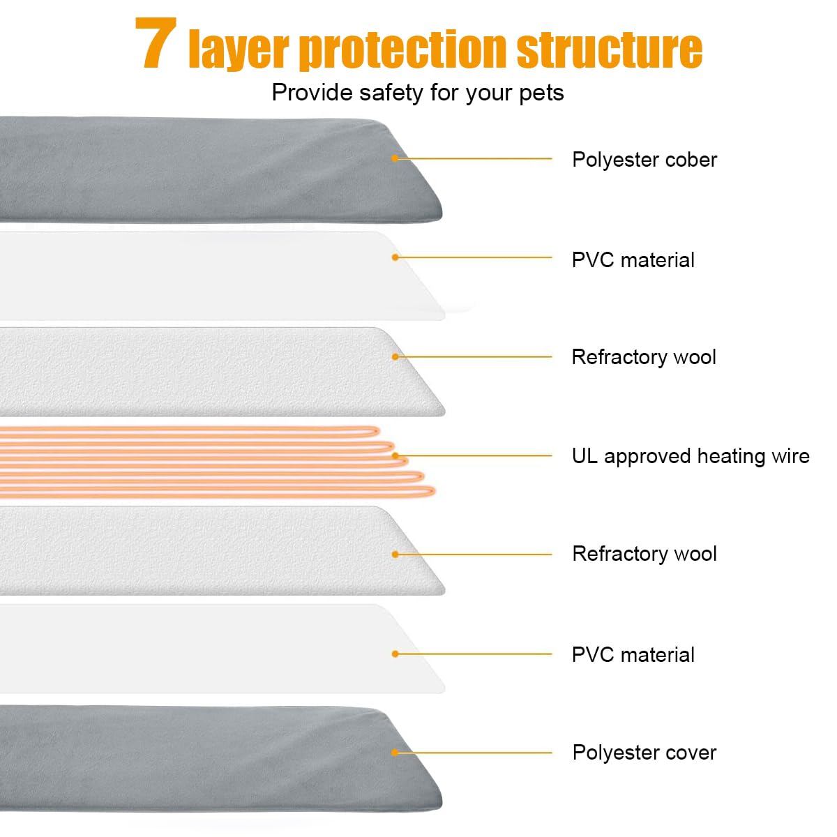 Safey and Secure Stucture : 7 layer Protection Structure with UL approved heating wire will prevent your pet from get burnt. With temperature sensor inside warming mat can avoid overheating to protect your pets