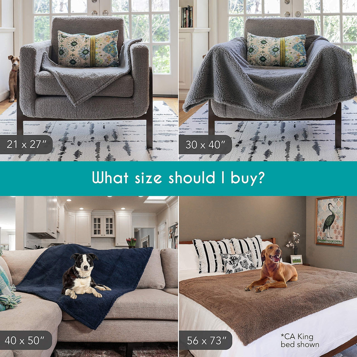 rocket & rex original water proof dog blankets are versatile, stylish, and both functional and beautiful. Made with our proprietary design of soft faux suede, fuzzy sherpa microfiber fleece and an impermeable, waterproof inner membrane lining. Our pet blankets and throws prevent liquid from seeping through, protecting your family home and furniture from pet damage and messes (slobber, dander, shedding, urine or pee, hair, fur, you name it!), keep your pets warm, cozy and comfortable, and your home looking great. Offered in four sizes and three modern, neutral colors (grey, blue and brown), select the perfect match for your needs. Our multi-layered design is suitable for all breeds and life stages. Our small 21 x 27' waterproof fleece throw is perfect to use on love seats or chairs. Our medium 30 x 40' size is a great pet blanket for furniture like chairs, kennels, crates, sofas and sectional cushions and twin or full size beds. Our large 40 x 50' is a great dog couch blanket or a perfect cover for queen or king size beds, while our extra-large 56 x 73' size is great for larger surfaces, like a CA King bed or extra protection on your couch or larger surfaces. Machine wash on a cold and gentle cycle and tumble dry low heat. Our blankets are durable, easy to clean and the fabric gets softer with use.