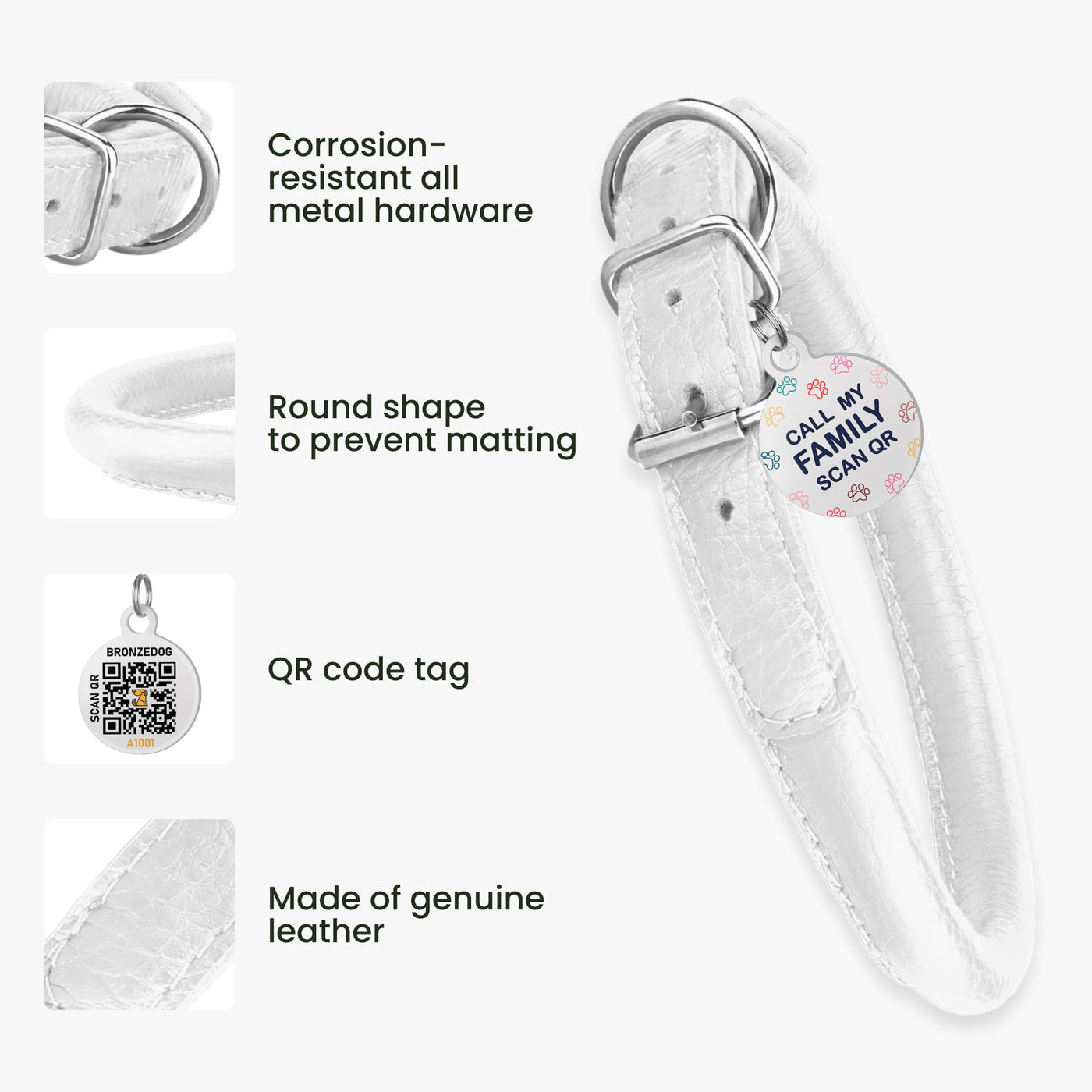 Rolled Leather Dog Collar Soft Round Collars, Id Tag For Small Medium Large Dogs (11-14 Inch, White)
