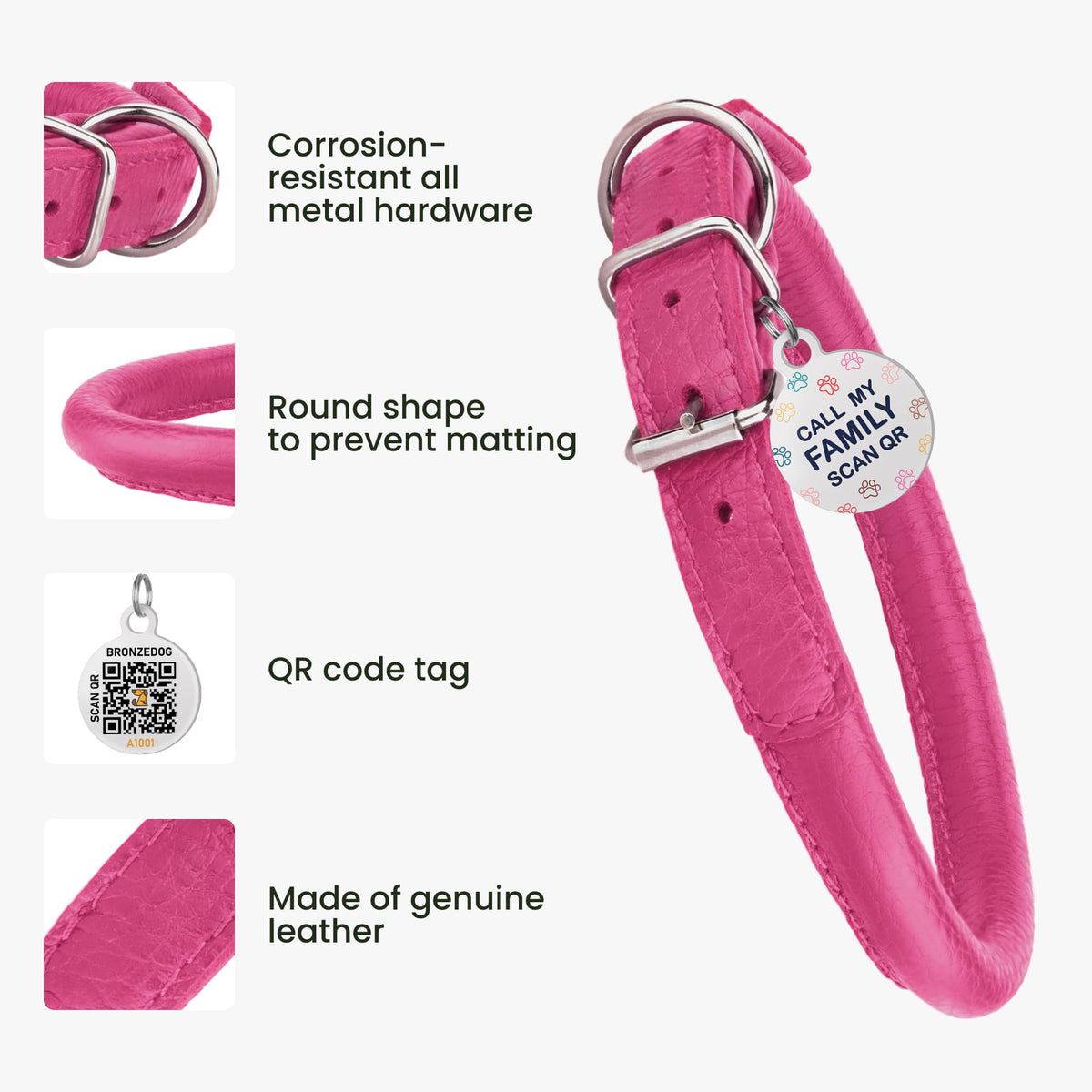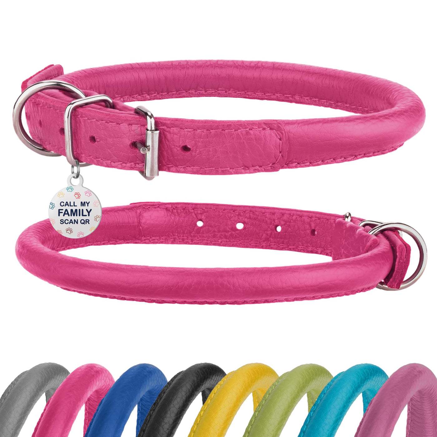 Rolled Leather Dog Collar Soft Round Collars, Id Tag For Small Medium Large Dogs(19-22 Inch, Pink)
