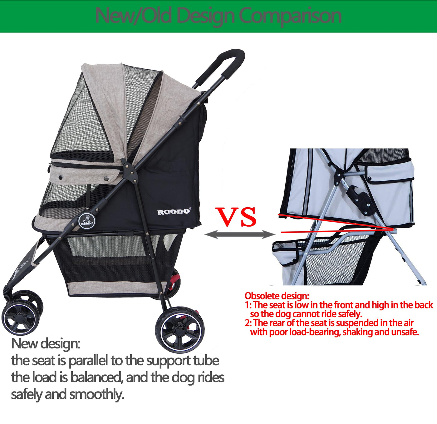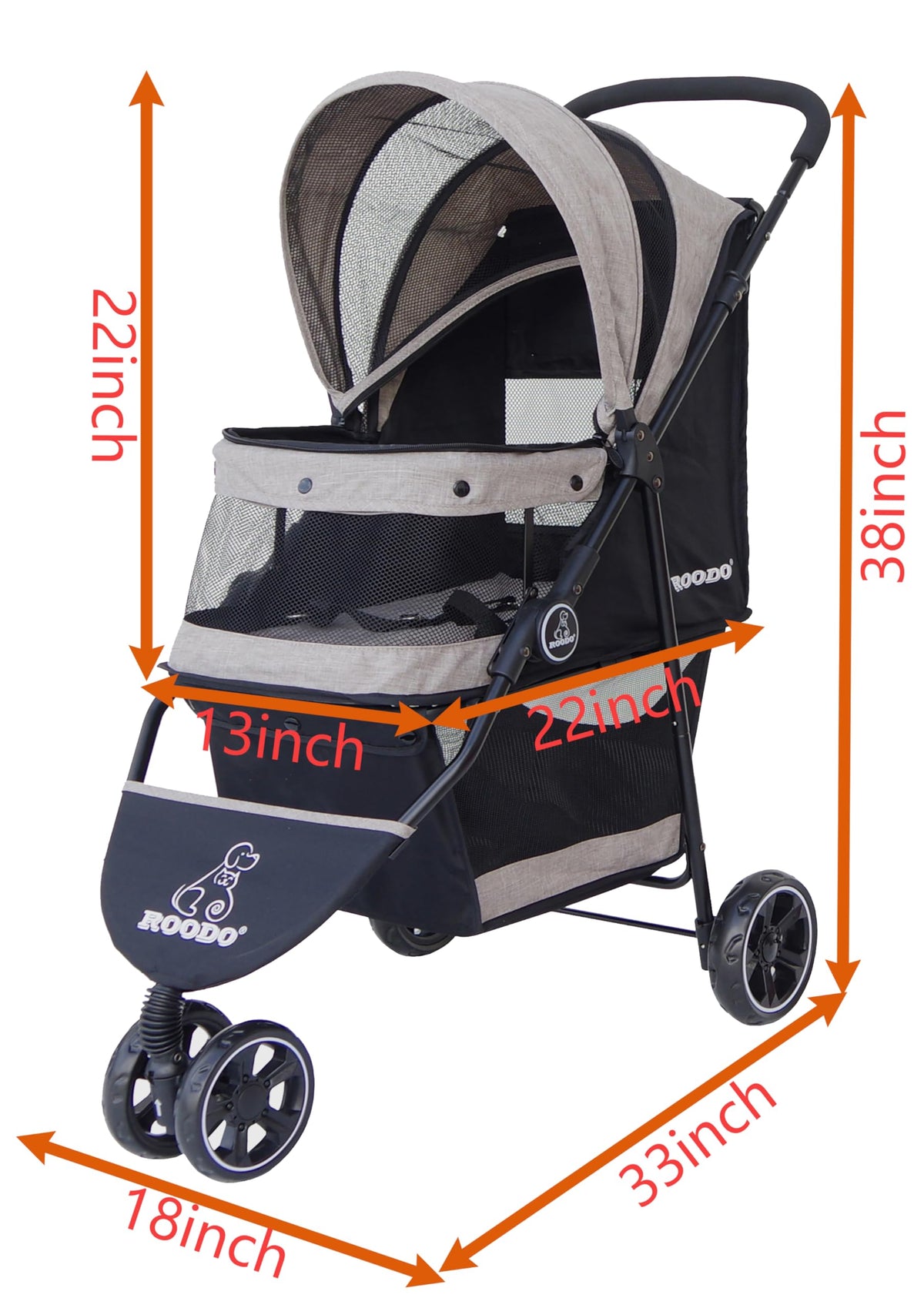 Roodo Escort Upgrade Fourth Generation 3 Wheel Pet Strollers,Dog Strollers,Cat Strollers. Front/Rear Wheel Shock Absor,The 5.5-Inch Front Wheel Rotates 360, And The 6.5-Inch Rear Wheel Has A Brake Lever. Easy To Fold, Small Volume After Folding(14*6*33Inch), Easily Fit Into The Trunk Of The Car?4.8Kg Is Easy To Carry, Convenient For Travel. The 22*13*22-Inch Cockpit Can Accommodate Around 30 Pounds Of Small Dogs, Cats And Small Pets. In The Purchase, Please Pay Attention To Measure Your Dog, Kitten Length, Height, To Avoid Unnecessary Returns, Resulting In Waste And Environmental Damage.