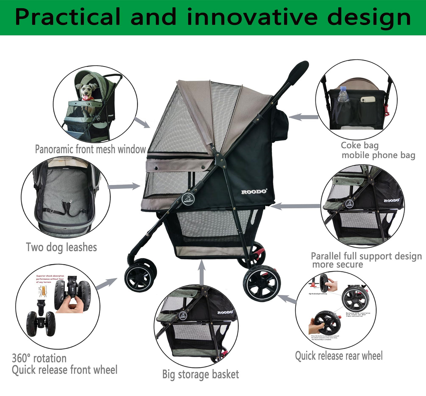 ROODO Escort Upgrade fourth generation 3 Wheel pet strollers,dog strollers,cat strollers. front/rear wheel shock absor,The 5.5-inch front wheel rotates 360, and the 6.5-inch rear wheel has a brake lever. easy to fold, small volume after folding(14*6*33inch), Easily fit into the trunk of the car?4.8KG is easy to carry, convenient for travel. The 22*13*22-inch cockpit can accommodate around 30 pounds of small dogs, cats and small pets. In the purchase, please pay attention to measure your dog, kitten length, height, to avoid unnecessary returns, resulting in waste and environmental damage.