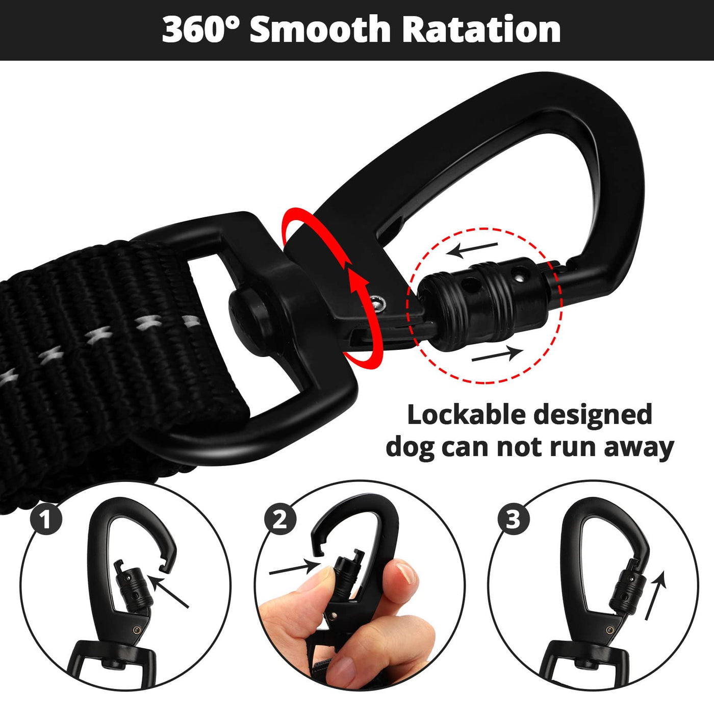 Q: What is the benefit of the 360° swivel lockable hook?A: The 360° swivel lockable hook prevents the leash from twisting and tangling, allowing your dog to move freely without getting caught. This design is made from strong zinc alloy, ensuring durability and reliability.