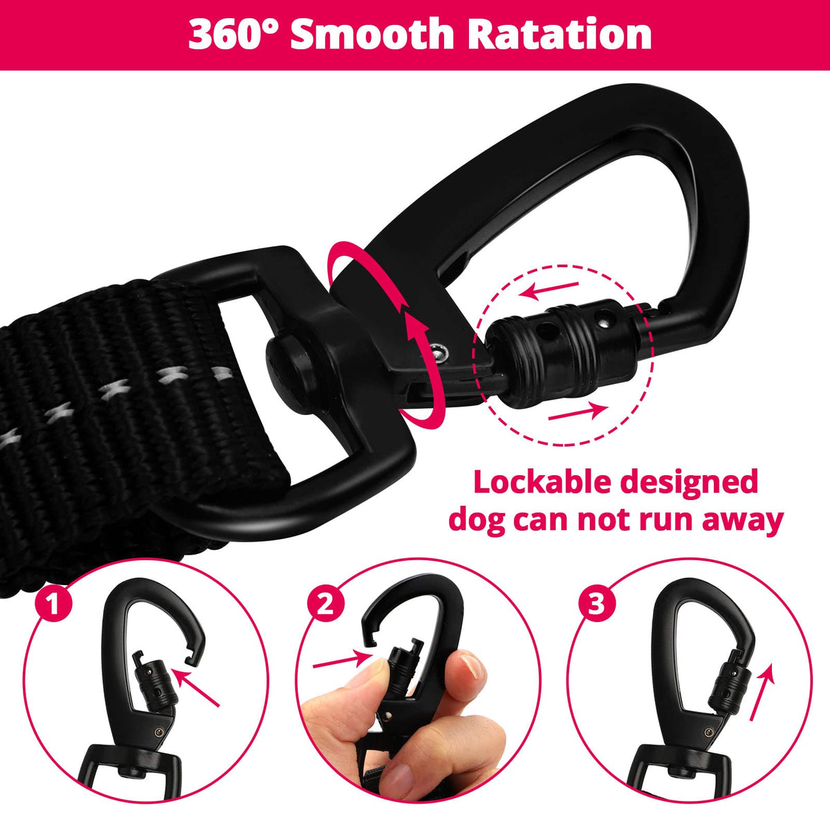 Q: What materials are used in the construction of the leash?A: The leash is made from ultra-durable rock climbing rope and features a 360° swivel lockable hook made of strong zinc alloy, ensuring durability and rust resistance.