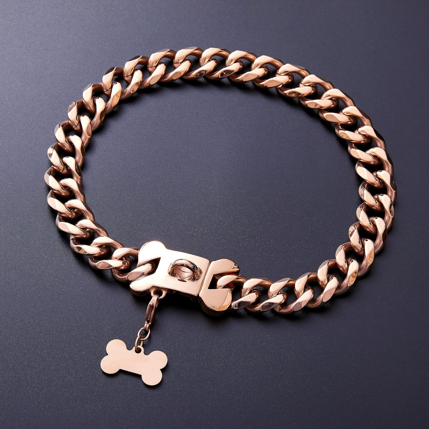 Rose Gold Stainless Steel Cuban Link Heavy Duty Dog Collar For Medium Large Dogs, American Bully French Bulldog Luxury Dog Colla