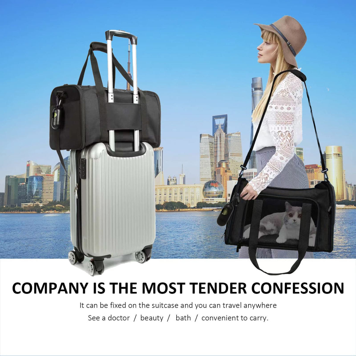 This R0SEBB product was crafted with the utmost care and attention to detail and quality. We make exceptional products in order and our goal is to exceed our customers pet care needs. The design of this pet carrier took 3 months of development with constant testing improve and ultimately produce this high quality pet carrier that is both convenient for you the consumer and safe and comfortable for your pet. Our ultimate goal is complete satisfaction for you our customer and a quality safe product for your pet. Put the package on your suitcase directly, and your pet can move forward with you synchronously. This design can lighten the burden for you and make your travel relaxed.