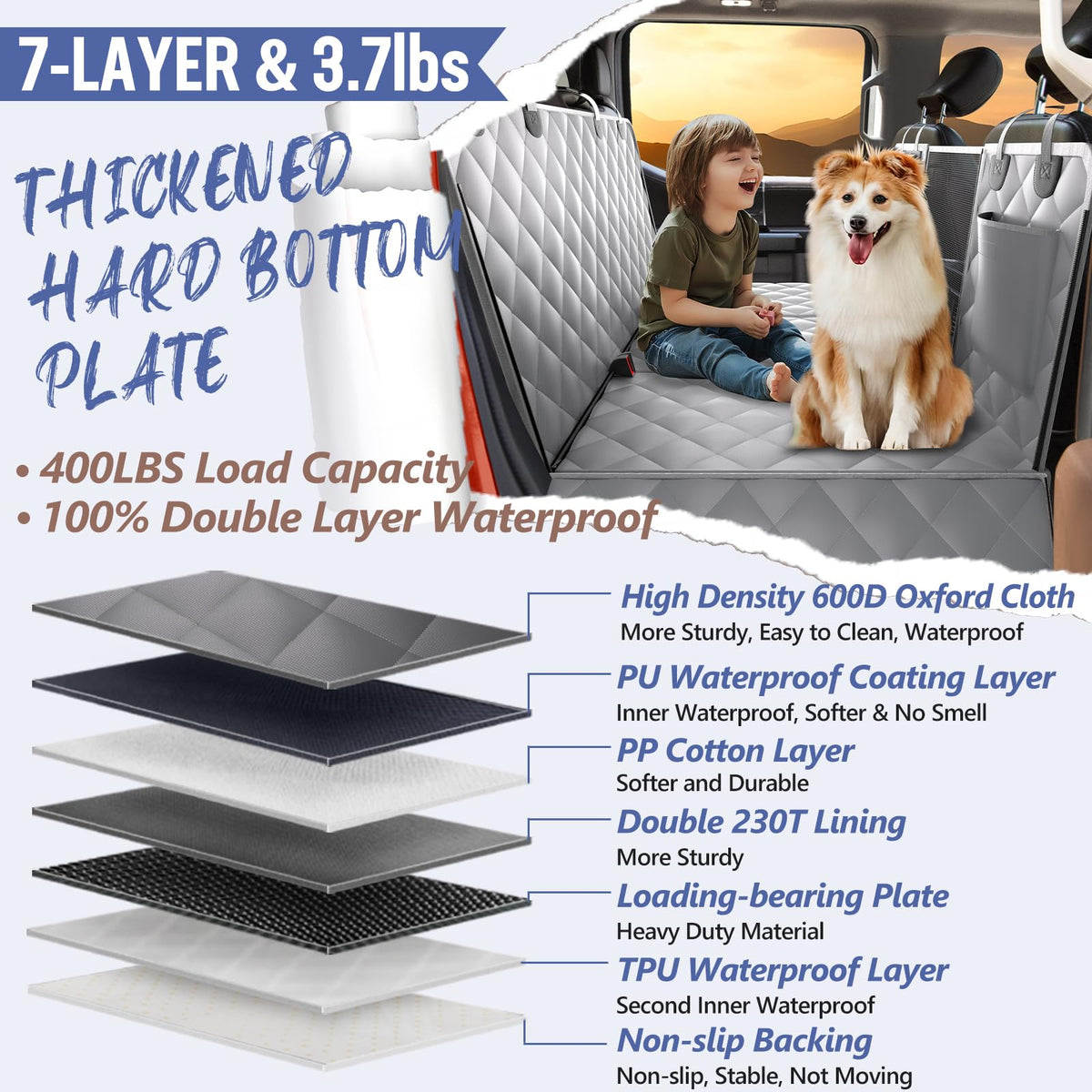 Q: Is the ROUWINNE Back Seat Extender waterproof?A: Yes, the ROUWINNE Back Seat Extender features a PU coating and a TPU internal waterproof layer, providing a double-layer waterproof effect that keeps your backseat protected from spills, slobber, and pet hair, ensuring easy cleaning and maintenance.