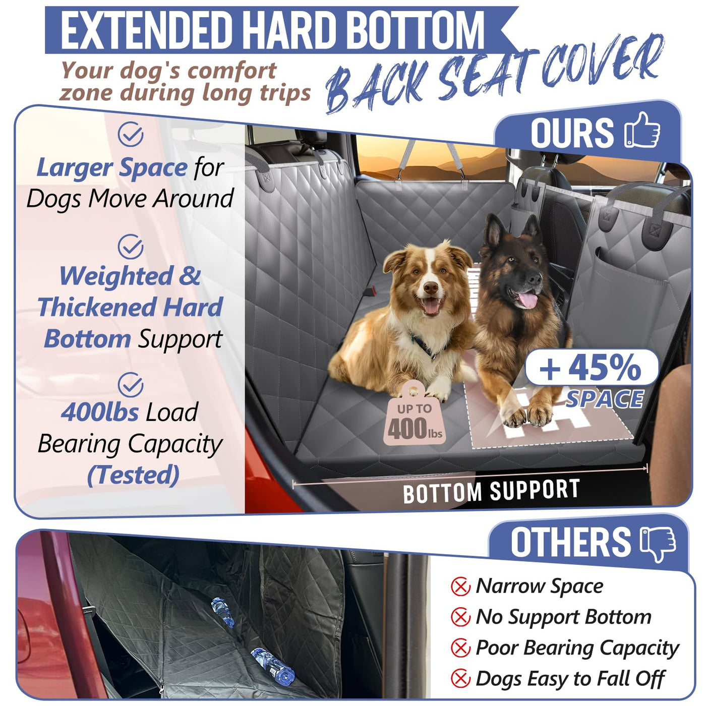 Q: How much weight can the ROUWINNE Back Seat Extender hold?A: The ROUWINNE Back Seat Extender is tested to hold up to 400 lbs, making it ideal for large dogs or multi-dog families. Its sturdy hard bottom design ensures safety and stability for pets during travel.
