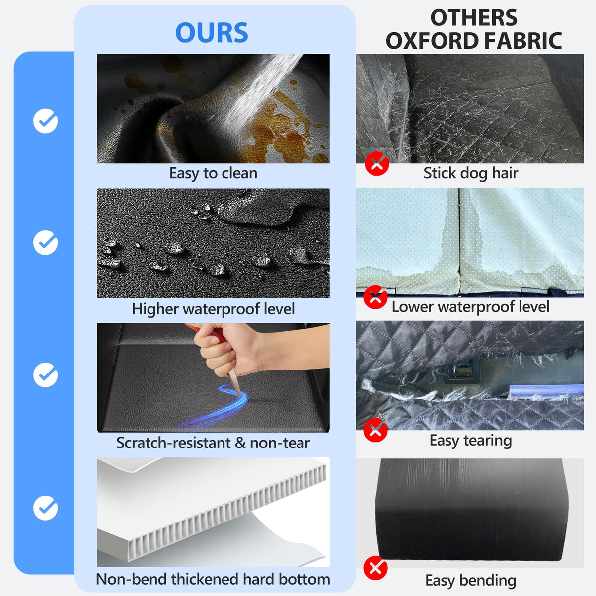 Introducing the ultimate solution for pet owners on the go - our dog car seat cover for back seat! Adopting the latest upgraded faux pu leather material, scratch-resistant and wear-resistant. Waterproof upgrade, no seepage and splash-proof. And the surface is easier to clean, both soft and firm. Dogs can feel both soft and secure on it. But that's not all - we've taken pet comfort to the next level. Our seat extender for dogs features three sturdy load-bearing plates, transforming your backseat into a comfortable backseat extender for dogs Your pets will have ample space to relax and stretch out, ensuring they stay calm and content throughout the ride. plus, back seat extender for dogs can support up to an impressive 400 lbs, accommodating even larger dogs. We understand that some pets may struggle with getting in and out of the car, especially older dogs. That's why our car seat cover dog is equipped with practical side flaps. These flaps protect your backseat and car doors from scratches while providing easy access for your furry companion. The innovative up/down zippers make it effortless for elderly dogs to enter and exit the vehicle, ensuring a stress-free experience for both of you. Imagine the convenience of having a car seat cover that effortlessly combines durability, convenience, and maximum comfort for your four-legged friend. With our back seat cover for dogs in car, you can enjoy peace of mind knowing that your car remains clean and your pet stays cozy. It's time to embrace worry-free adventures with your furry companion by your side. Invest in a dog back seat extender today and transform your travel experience. Say goodbye to constant cleaning and hello to stress-free journeys. Your pet will thank you, and you'll wonder how you ever traveled without it.