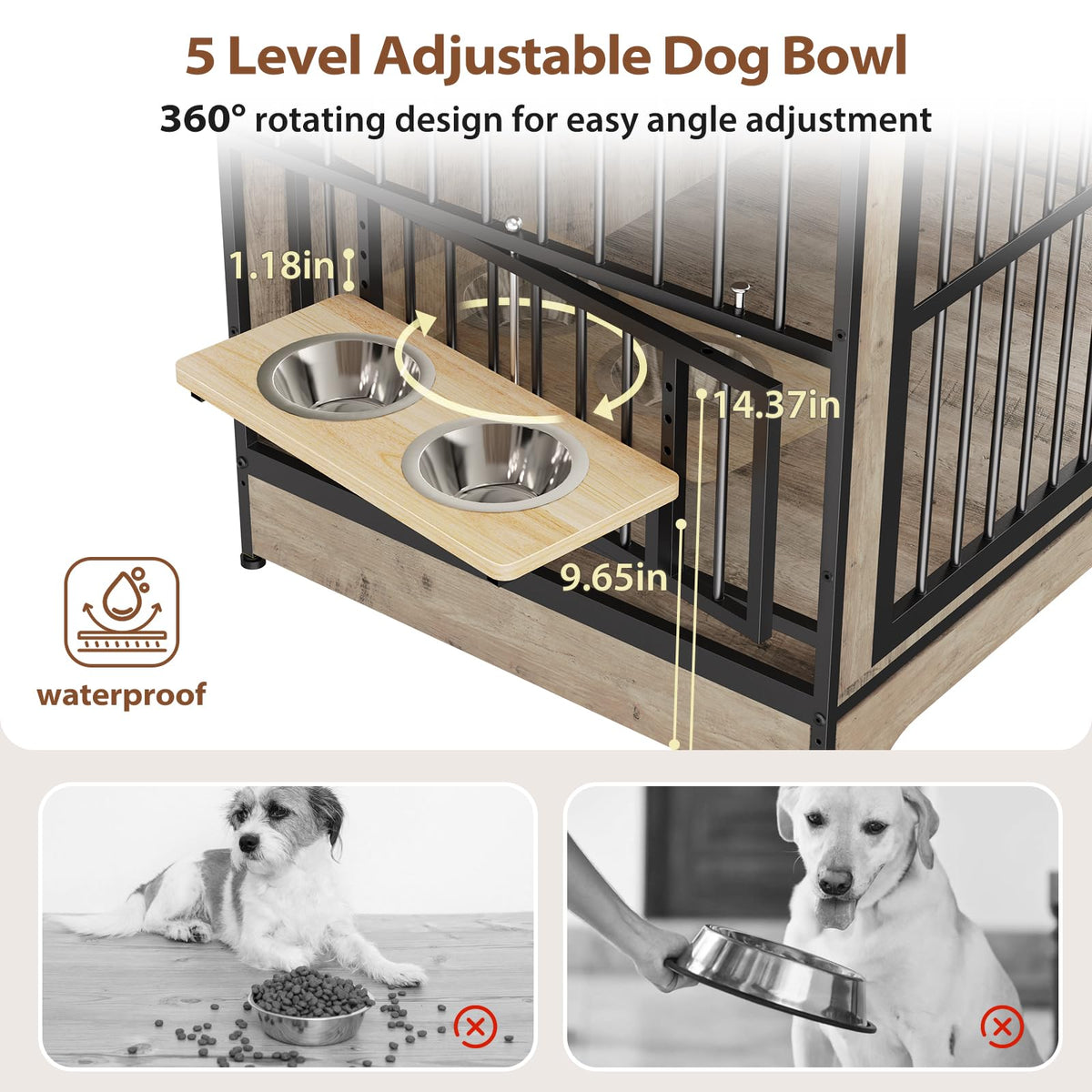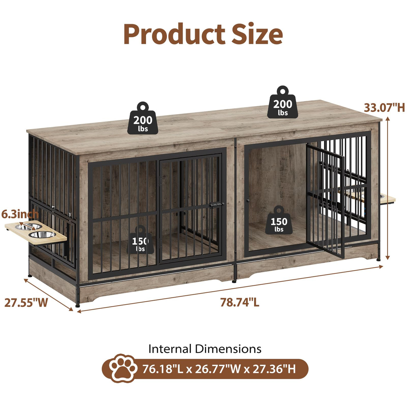 Rovibek 78 Double Dog Crate Furniture for 2 Large Dogs Indoor, Wooden Furniture Dog Crates with Dog Bowl, Dog Kennel Furniture T