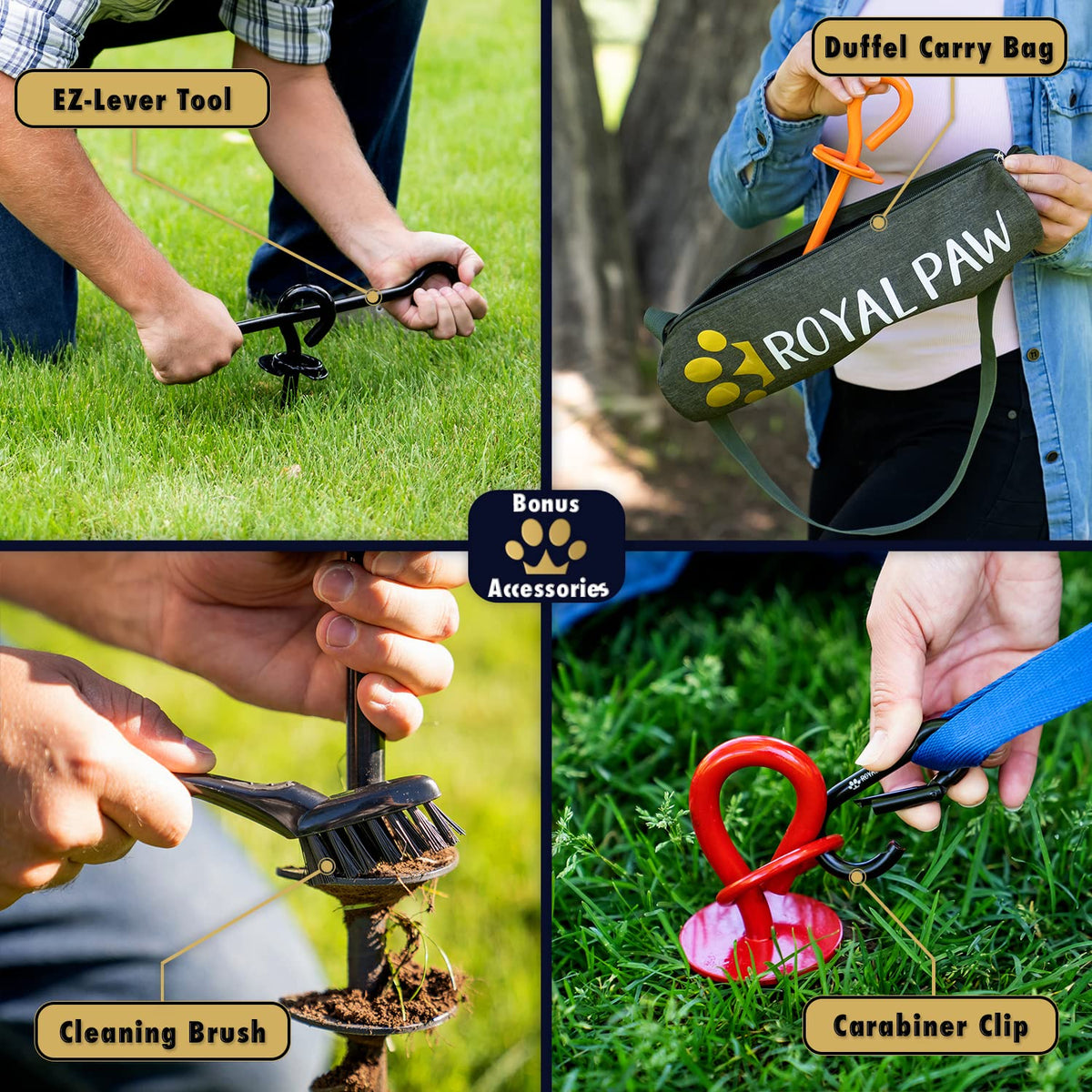 Q: Is the ROYAL PAW Dog Tie Out Stake durable?A: Yes, the stake is made from high-quality stainless steel, ensuring exceptional durability and longevity. Each purchase also comes with a lifetime warranty upon registration.