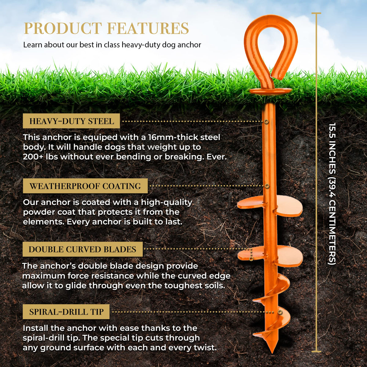 Q: How easy is it to install the dog stake?A: Installation is quick and easy, taking under a minute. The unique Curved Double Blades and Spiral-Tip design allow for smooth installation on various ground surfaces.
