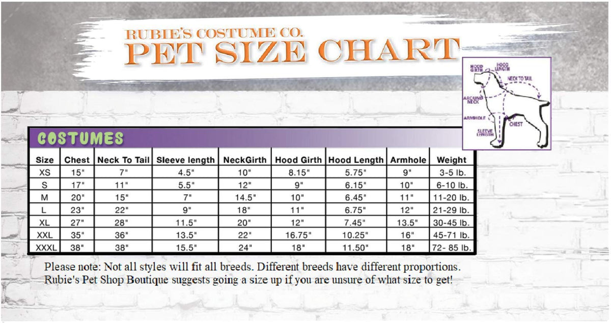 Q: What sizes does the Rubie's Marvel Black Panther Pet Costume come in?A: The Rubie's Marvel Black Panther Pet Costume is available in various sizes, including Small. It's essential to refer to Rubie's Pet Size Chart and watch the sizing instruction video to ensure the best fit for your pet, as not all costumes will fit all pets.
