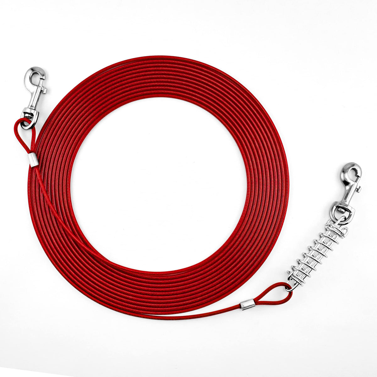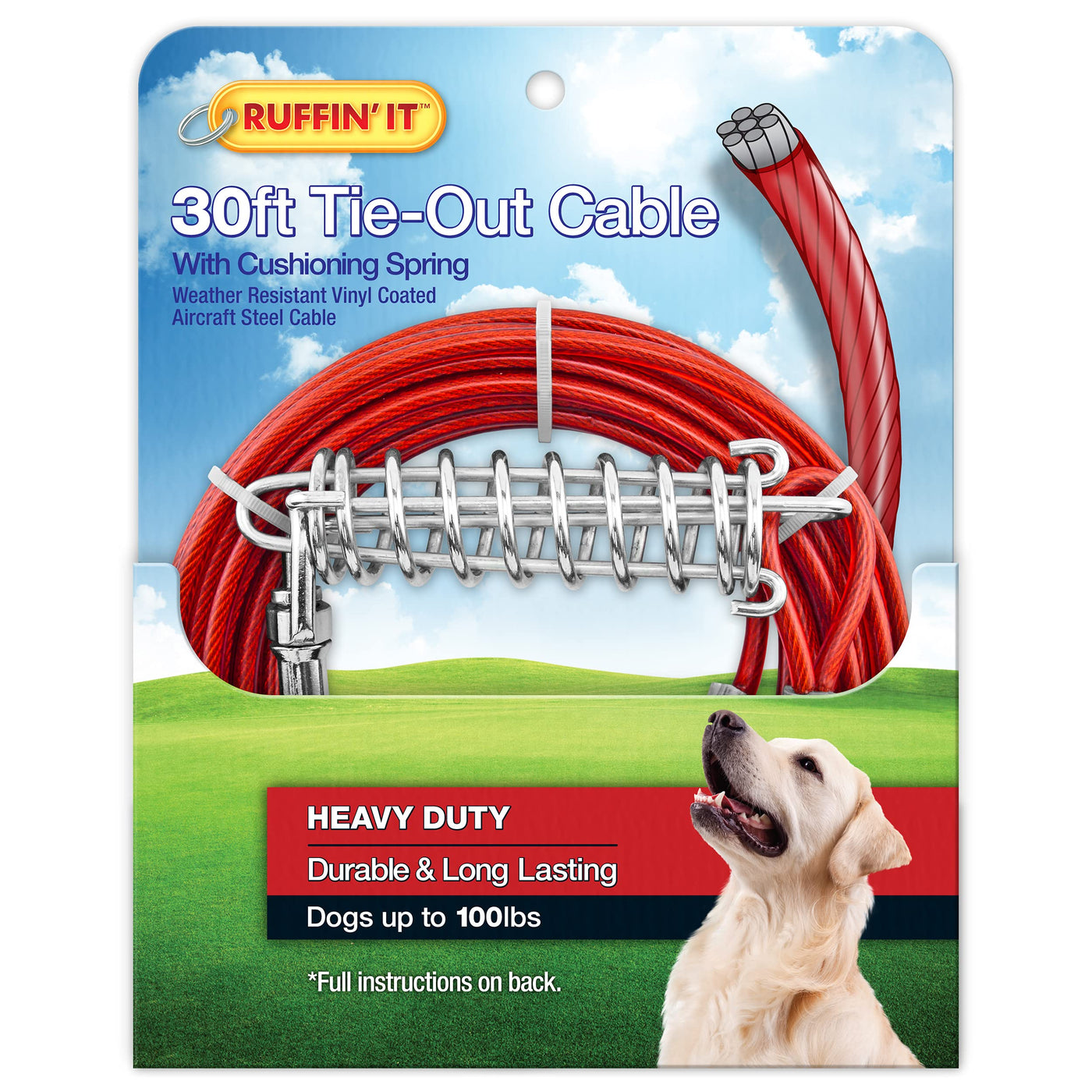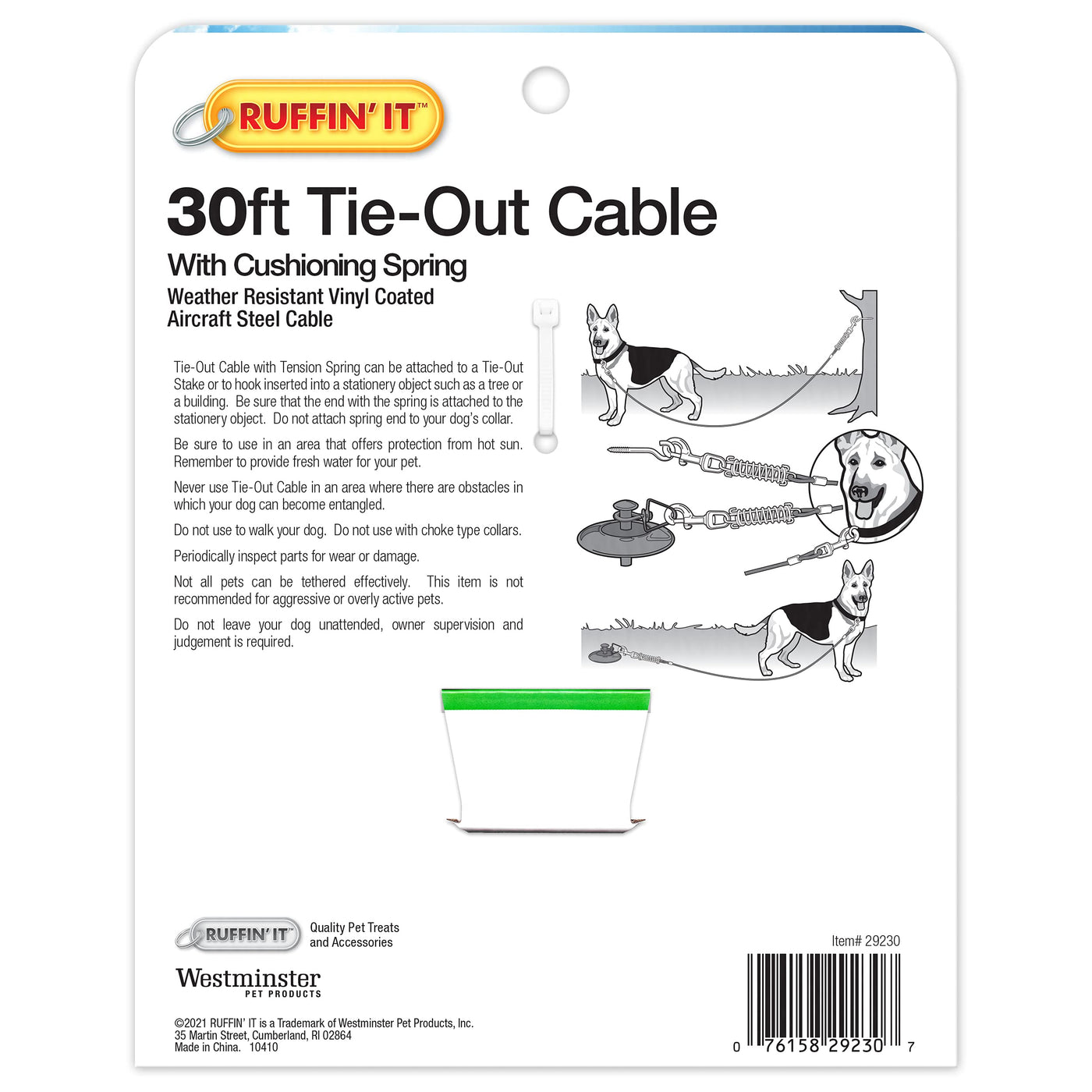 RUFFIN' ITs 30ft Cable Tie-Out with cushioing spring has tempered steel construction and is rust-resistant. This tie-out is recommended for dogs up to 100lbs.