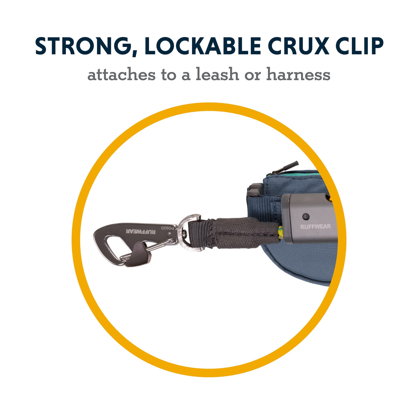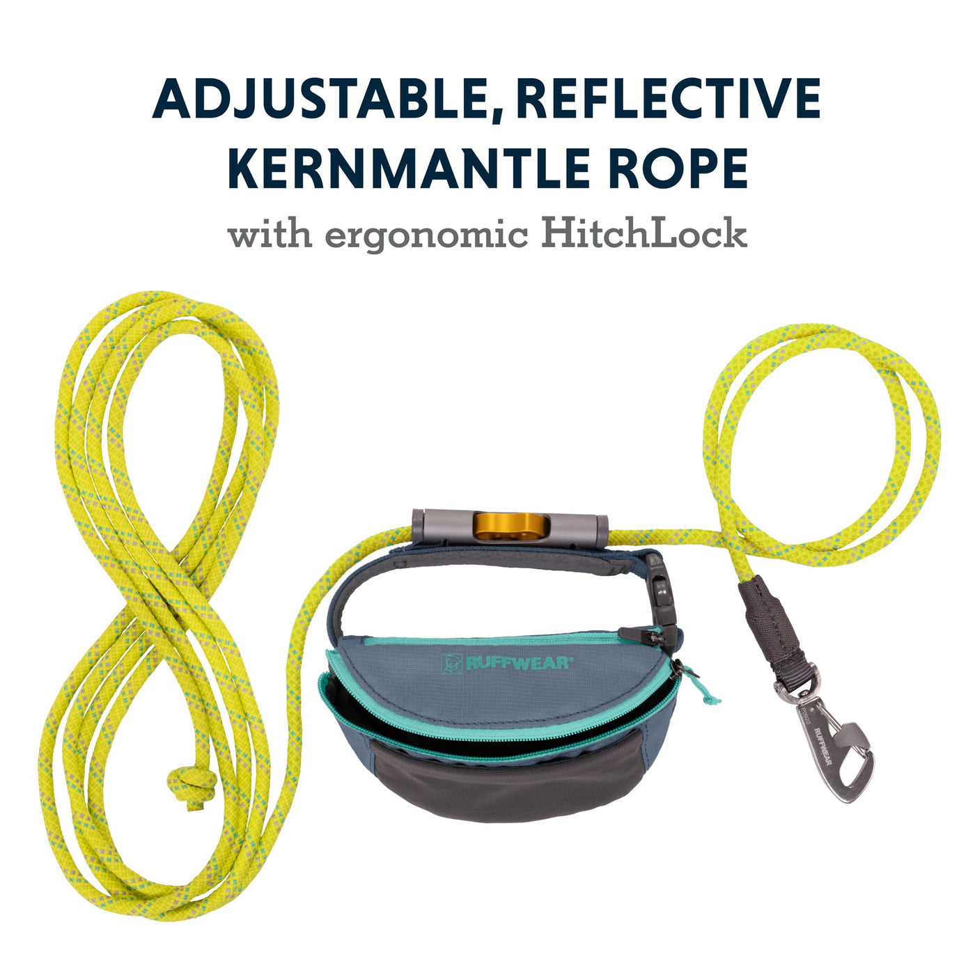 A two-in-one leash and hitching system for hiking, camping and more; Made with durable, climbing-inspired rope and designed to be worn around your waist for hands-free adventures | Switch between leash and hitch with ease; Features an ergonomic HitchLock to lock the rope under tension; Adjust the length manually by letting out and taking in slack by hand | The Hitch Hiker is made to last; Features a light, strong, lockable Crux Clip to attach to a collar or harness and 12 feet of strong, supple, reflective kernmantle rope for a secure connection | Can be used hands-free, hand-held, or secured around a post or tree; The integrated stow bag is durable, water-repellent, and conveniently holds the rope tail end | Features an adjustable, stowable strap for extra versatility; The Hitch Hiker features a total length of 36 ft (12 m) and the stow bag measures 6 x 7 x 2 in (16 x 18.5 x 5 cm)