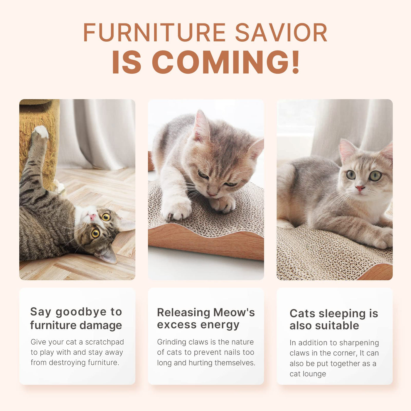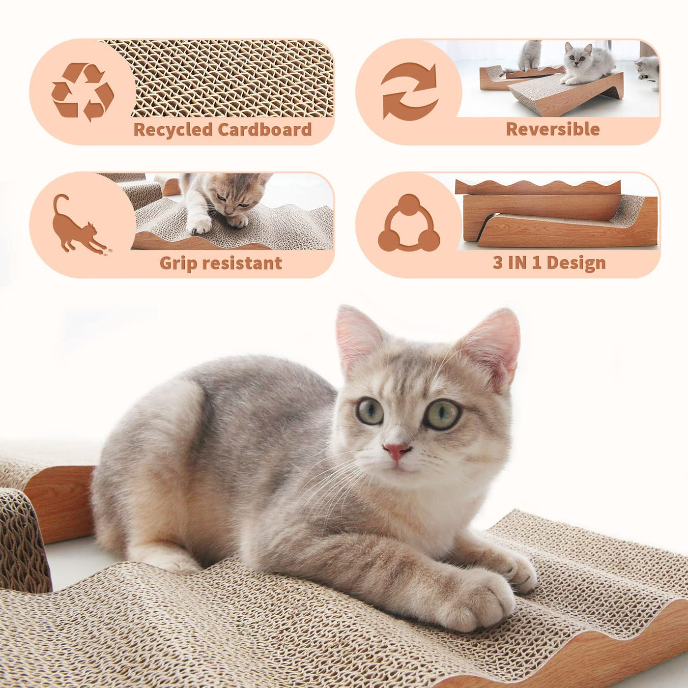 This cat scratch pad is designed with double-sided gripping board and the material chosen is higher density corrugated board which enables the product to last longer than most products cat scratching cardboard pads provide an outlet for cats to scratch and reduce unnecessary scratching of other furnitures This is important to keep your cats claws healthy Our cat scratching is made of eco-friendly and recyclable non-toxic corrugated paper and contains no harmful materials Very safe for your kitten Our cat scratch board includes two packs of organic catnip to help you divert your cats attention from the couch to the cat scratchers If you are not satisfied with our products after your purchase please feel free to contact us We will solve the problem for you within 24 hours Your satisfaction is our ultimate goal