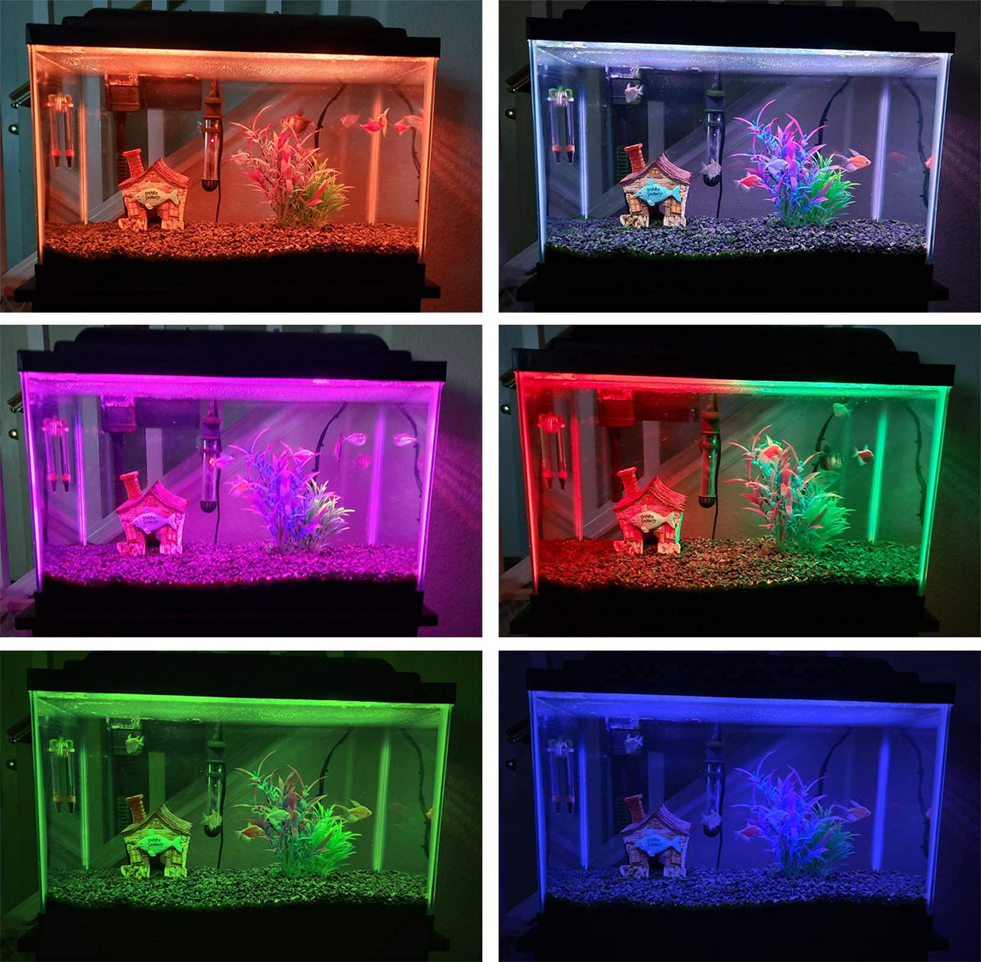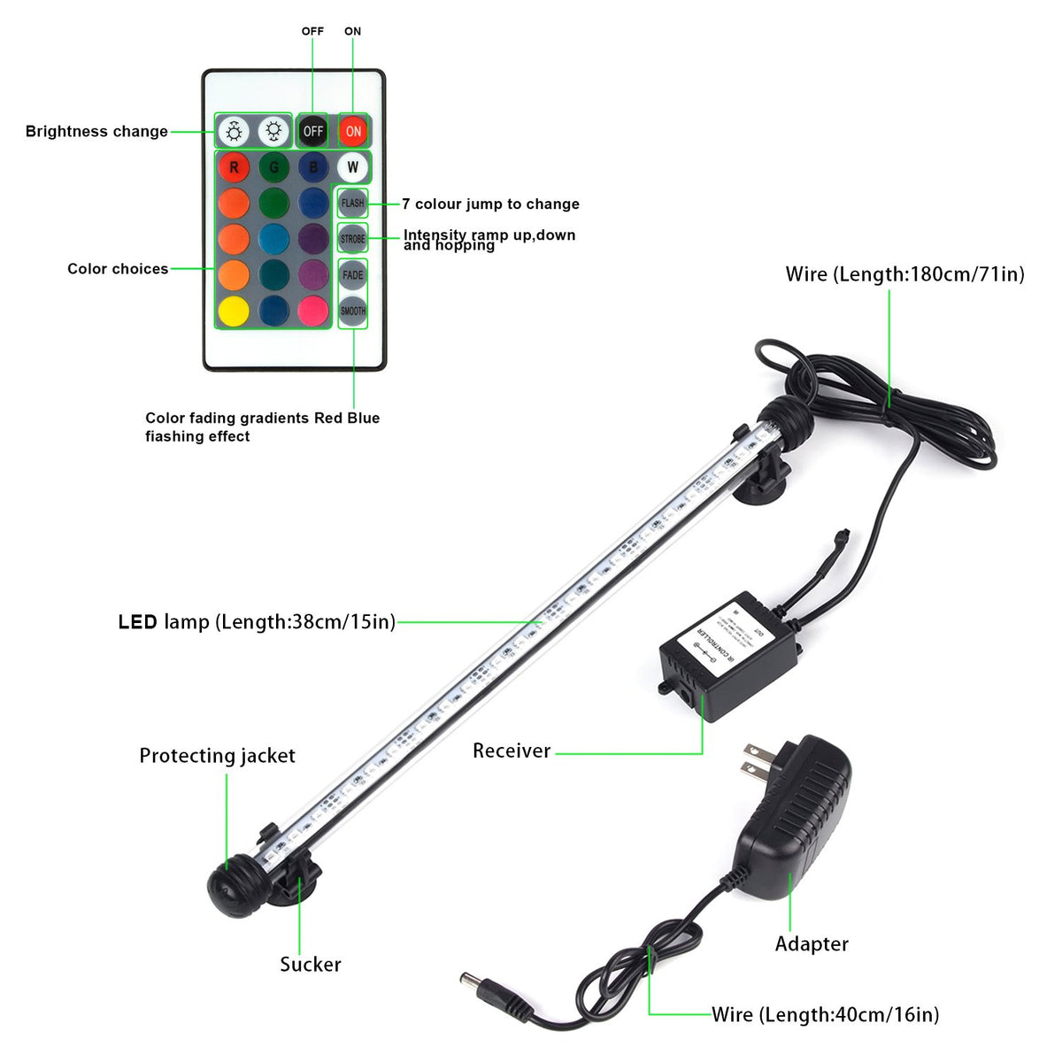 Smiful Fish Tank Light This waterproof LED fish tank light gives you a brighter and safer aquariums landscape light support. Specifications: Waterproof: IP68 Waterproof for the LED bar Smiful Fish Tank LightThis waterproof LED fish tank light gives you a brighter and safer aquariums landscape light support.Specifications:Waterproof: IP68 Waterproof for the LED bar Numbers of LED Lights: 21Light Color: 16 color with 4 modesLED Light Type: 5050Light Bar Length: 15 inch(38 cm)Fiting Aquariums: 15-30 inchesPower Cable Length: 5.55 inch(1.85 m)Input: AC 100-240V / 47-63HzOutput: DC12V/500mAMaterial: ABS plastic and acrylic glassPower plug: US plug(note: the Power Adapter, switch and remote are Non-submersible!)Package includes:1 x fish tank light bar with power cord2 x suction cups1 x adapter1 x remote control