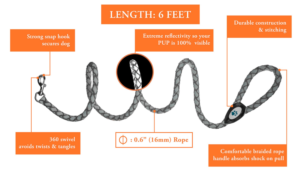 Safetypup Xd Reflective Dog Leash. Heavy Duty And Durable For Large And Medium Breeds. 6 Ft Long Rope, Tangle Free Braided Leash