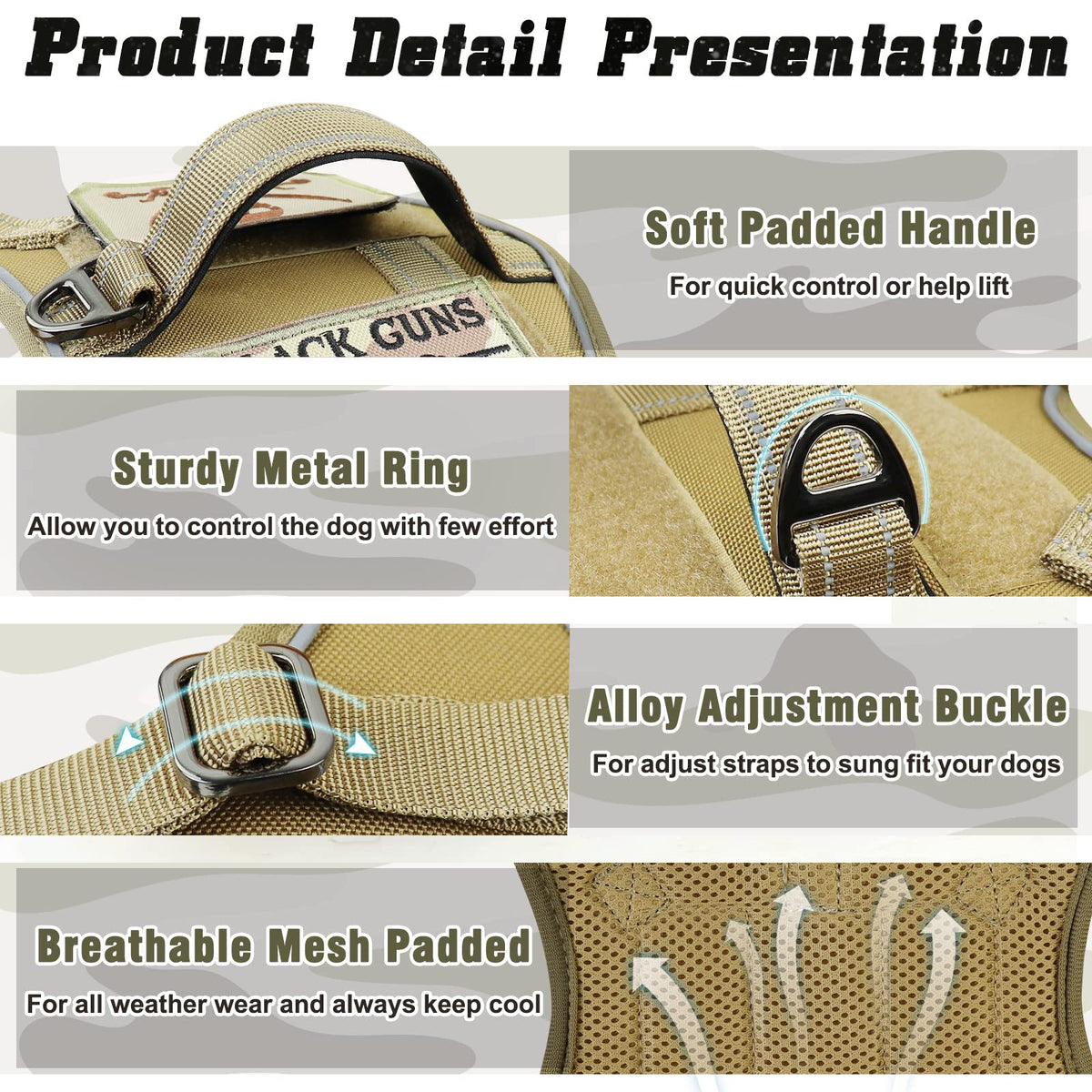 Key Feature of the Tactical Dog Harness: √”X” stitching by nylon threads, super tear resistant √1050D nylon,waterproof/stain resistant/durability √Vertical padded handle √Front & Back Clip √Functional MOLLE System √Easy Put on/off & Adjust √Reflective Design Safer in the Night