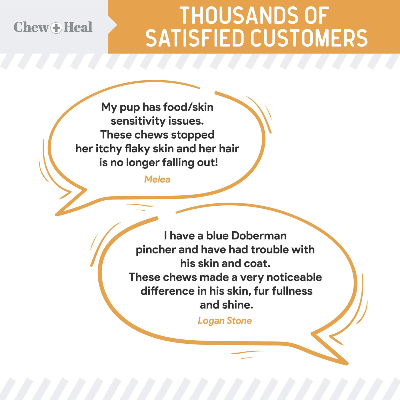 The Omega Skin + Coat Supplement from Chew + Heal is what your dog needs to boost skin health, improve coat appearance, and help with skin allergies.Formulated with a proper balance of essential fatty acids, antioxidants, vitamins, and minerals to help promote healthy skin and coat.Product Details For Dogs Over The Age Of 12 Weeks Omega-3 - Derived from fish & fish oil, walnuts, flax, and hemp seed. It is beneficial to pets skin and coat. Omega-6 - Essential for maintenance of skin and coat condition, normal growth, proper membrane structure, and absorbing fat-soluble vitamins. Omega-9 - Supports the immune system. Pre & Probiotics - Necessary to maintain proper health, as healthy gut flora is involved in resistance to disease. Enzymes Blend - Helps break down protein, carbs, fats, and cellulose, for better digestion. Calcium - Plays a role in regulating the skins many functions. Phosphorus - Necessary for cell repair and nutrient utilization. Biotin - Aids in cell growth. Brewers Yeast - Source of Vitamin B. Rose Hips - Source of Vitamin C. Zinc - Helps provide normal support for tissues including skin and joints.Feeding Directions:Up To 20 Lbs. - 2 Soft Chews21 To 40 Lbs. - 3 Soft Chews41 To 60 Lbs. - 4 Soft Chews 61 Lbs. And Over - 6 Soft ChewsAmount Can Be Divided Between AM & PM Meals.This product is intended for intermittent or supplemental feeding only. Due to the tasty nature of our products, do not leave package unattended around pets.