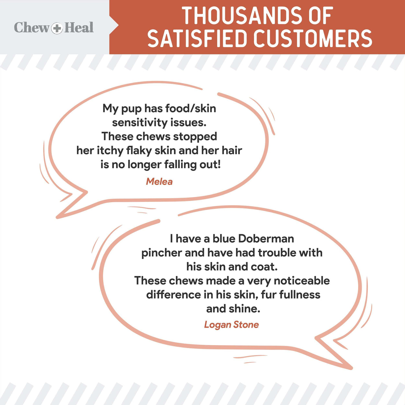 The Omega Skin + Coat Supplement from Chew + Heal is what your dog needs to boost skin health, improve coat appearance, and help with skin allergies.Formulated with a proper balance of essential fatty acids, antioxidants, vitamins, and minerals to help promote healthy skin and coat.Product Details For Dogs Over The Age Of 12 Weeks Omega-3 - Derived from fish & fish oil, walnuts, flax, and hemp seed. It is beneficial to pets skin and coat. Omega-6 - Essential for maintenance of skin and coat condition, normal growth, proper membrane structure, and absorbing fat-soluble vitamins. Omega-9 - Supports the immune system. Pre & Probiotics - Necessary to maintain proper health, as healthy gut flora is involved in resistance to disease. Enzymes Blend - Helps break down protein, carbs, fats, and cellulose, for better digestion. Calcium - Plays a role in regulating the skins many functions. Phosphorus - Necessary for cell repair and nutrient utilization. Biotin - Aids in cell growth. Brewers Yeast - Source of Vitamin B. Rose Hips - Source of Vitamin C. Zinc - Helps provide normal support for tissues including skin and joints.Feeding Directions:Up To 20 Lbs. - 2 Soft Chews21 To 40 Lbs. - 3 Soft Chews41 To 60 Lbs. - 4 Soft Chews 61 Lbs. And Over - 6 Soft ChewsAmount Can Be Divided Between AM & PM Meals.This product is intended for intermittent or supplemental feeding only. Due to the tasty nature of our products, do not leave package unattended around pets.