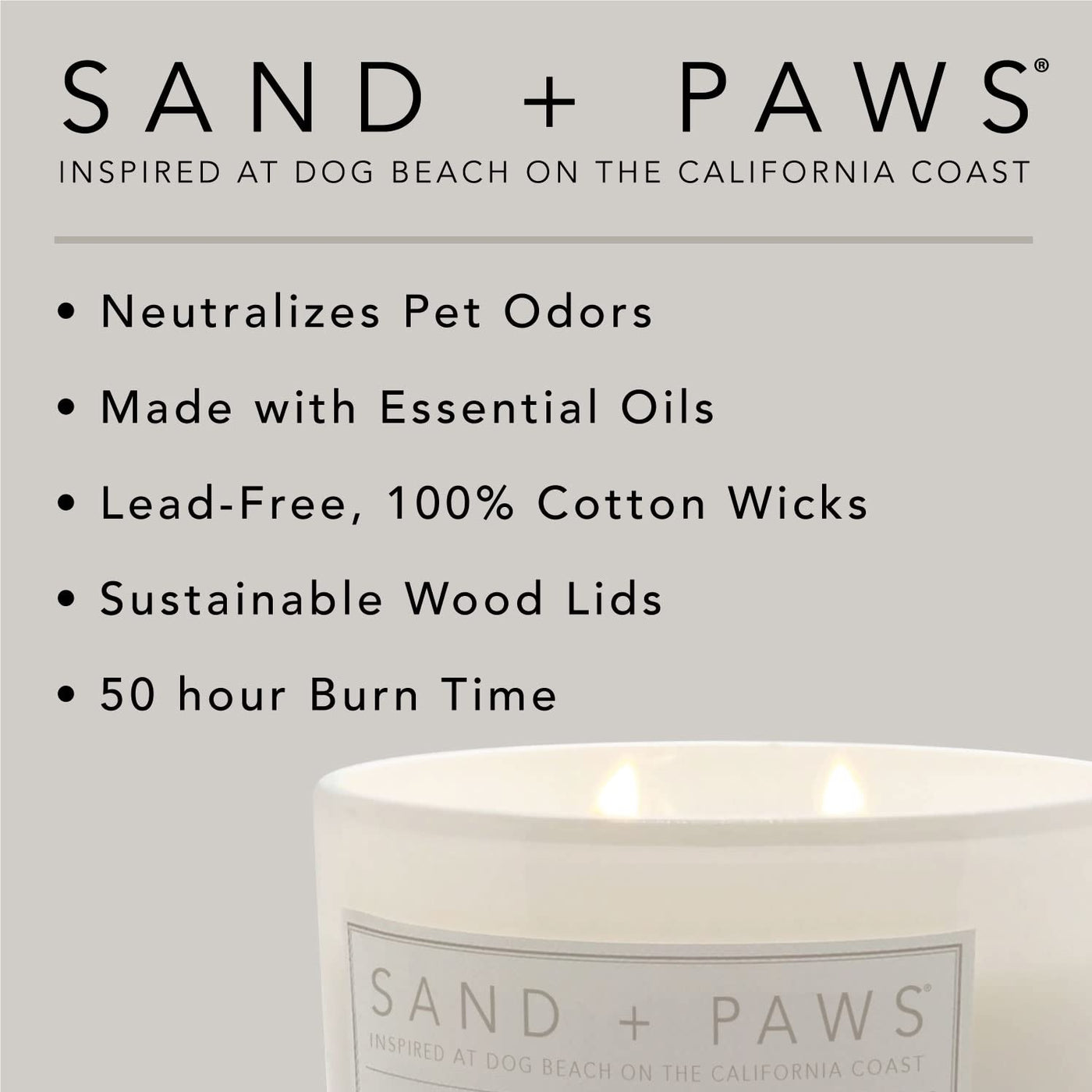 Sand + Paws was created by three women who love candles and love their dogs. Enjoying many fun days with our furry friends on Dog Beach in Southern California has led to too many wet and sandy paws to count. Bring light and happiness into your life with this Sand + Paws candle with our signature painted and carved wood lid. Our candles neutralize pet odors and other unwanted household and kitchen odors