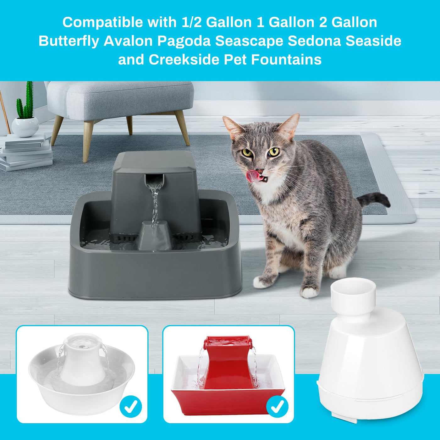 Q: What pet fountains are compatible with the SanKlev filter housing replacement?A: The SanKlev filter housing replacement is compatible with various pet fountains, including 1/2 Gallon, 1 Gallon, 2 Gallon models, as well as Butterfly, Avalon, Pagoda, Seascape, Sedona, Seaside, and Creekside fountains.
