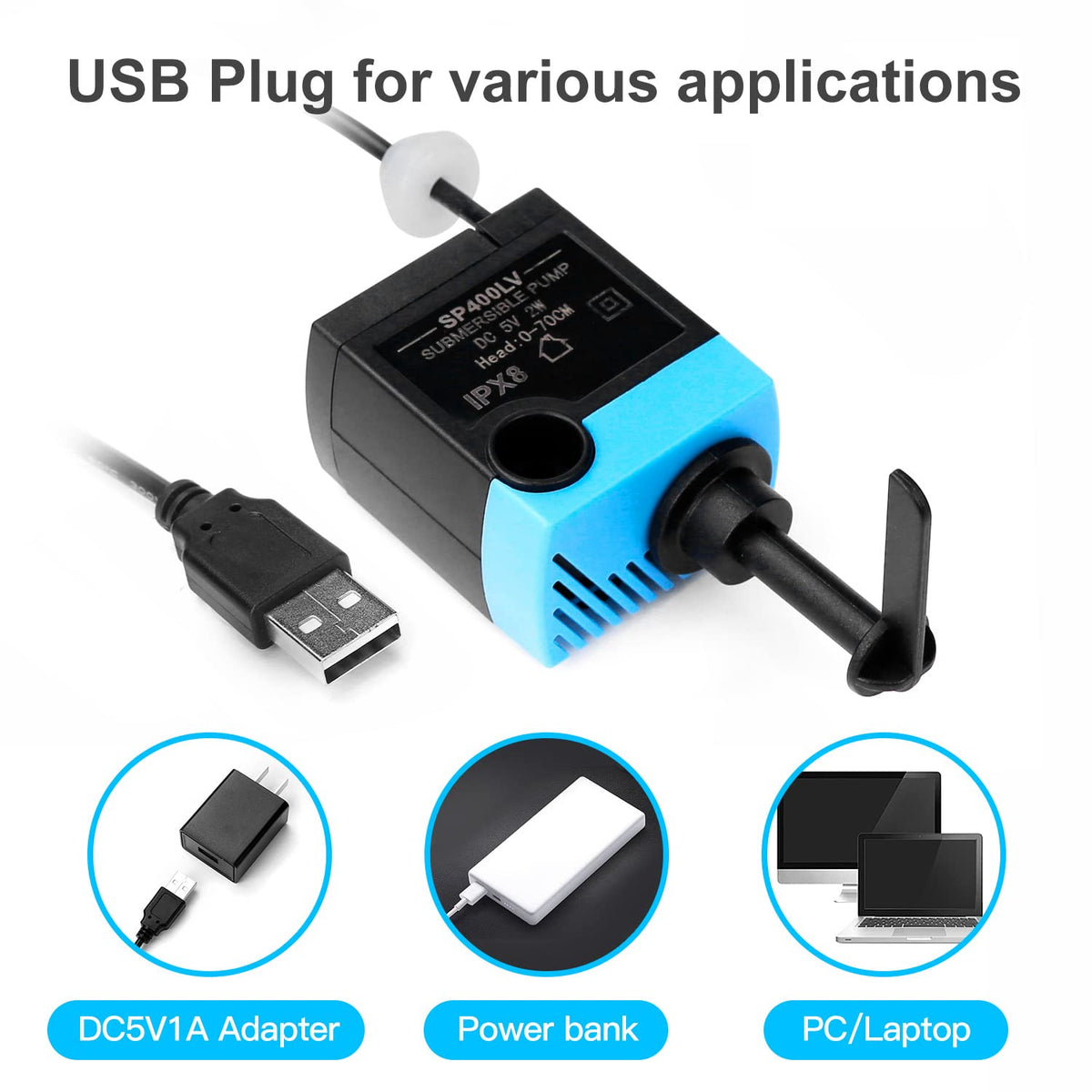 ?USB DC 5V?DC 5V low voltage and IPX8 waterproof provide strong vitality for the water pump For proper safety only use 5V/1A USB power adapters. (USB adapter is not included in the package).
