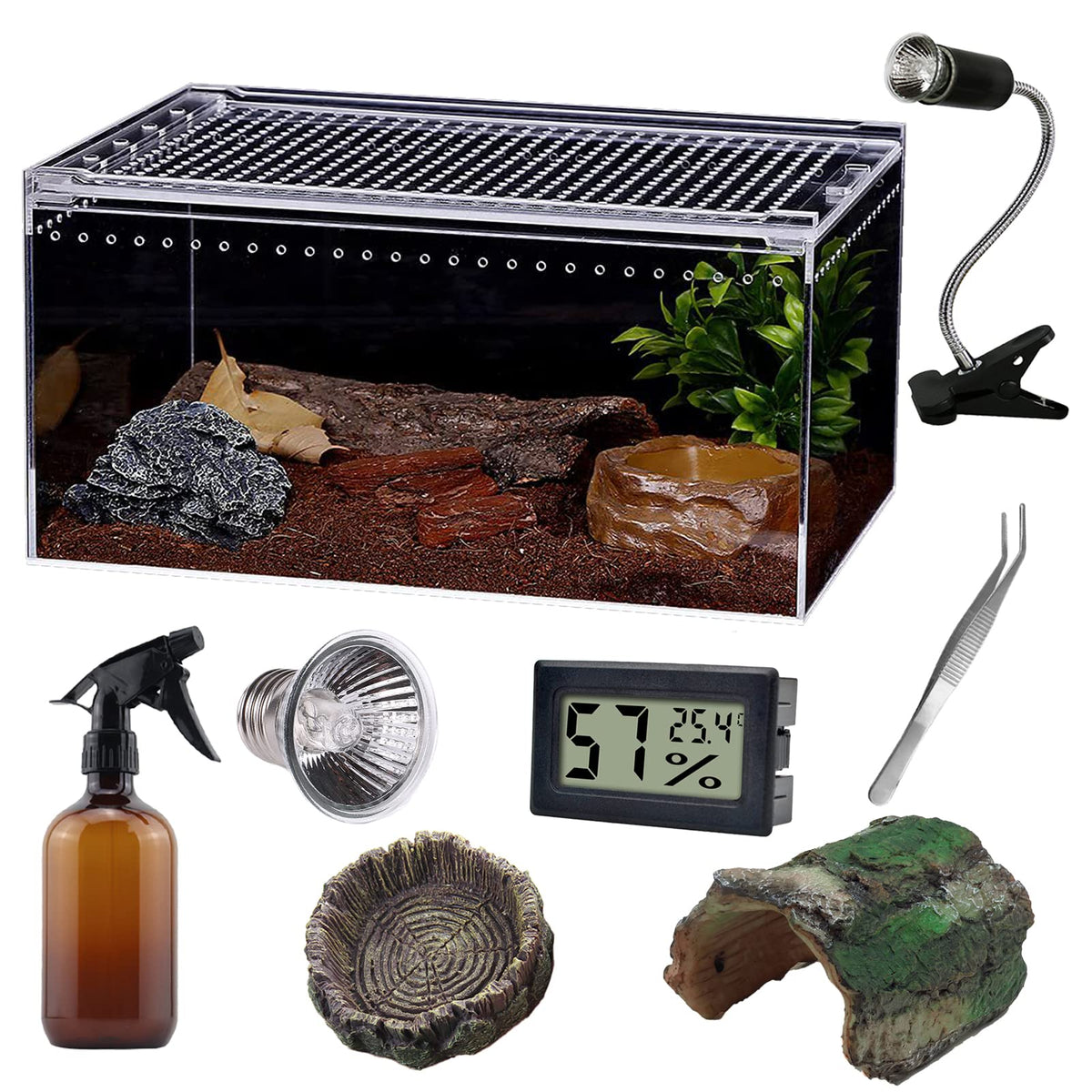 Whether You Are A Beginner Or A Reptile Enthusiast, It Can Meet The Specific Requirements Of Your Pets. It Is The Perfect Home For Your Small Reptiles, Amphibians, Or Invertebrates. They Are Also Ideal Temporary Habitats For Unique Invertebrates That You May Discover In Your Backyard. Designed With Increased Stability, They Are Made Of High-Quality, Thick, And Highly Durable Tempered Pc Glass Material For Added Safety. These Habitats Create A Safe Home For Your Pets. Product Size: 11.8X7.9X5.9 Inches Packing List: Tweezers, Hygrometer, Hideaway Cave, Lamp, Spray Bottle, Water, Reptile Box, Light Bulb.
