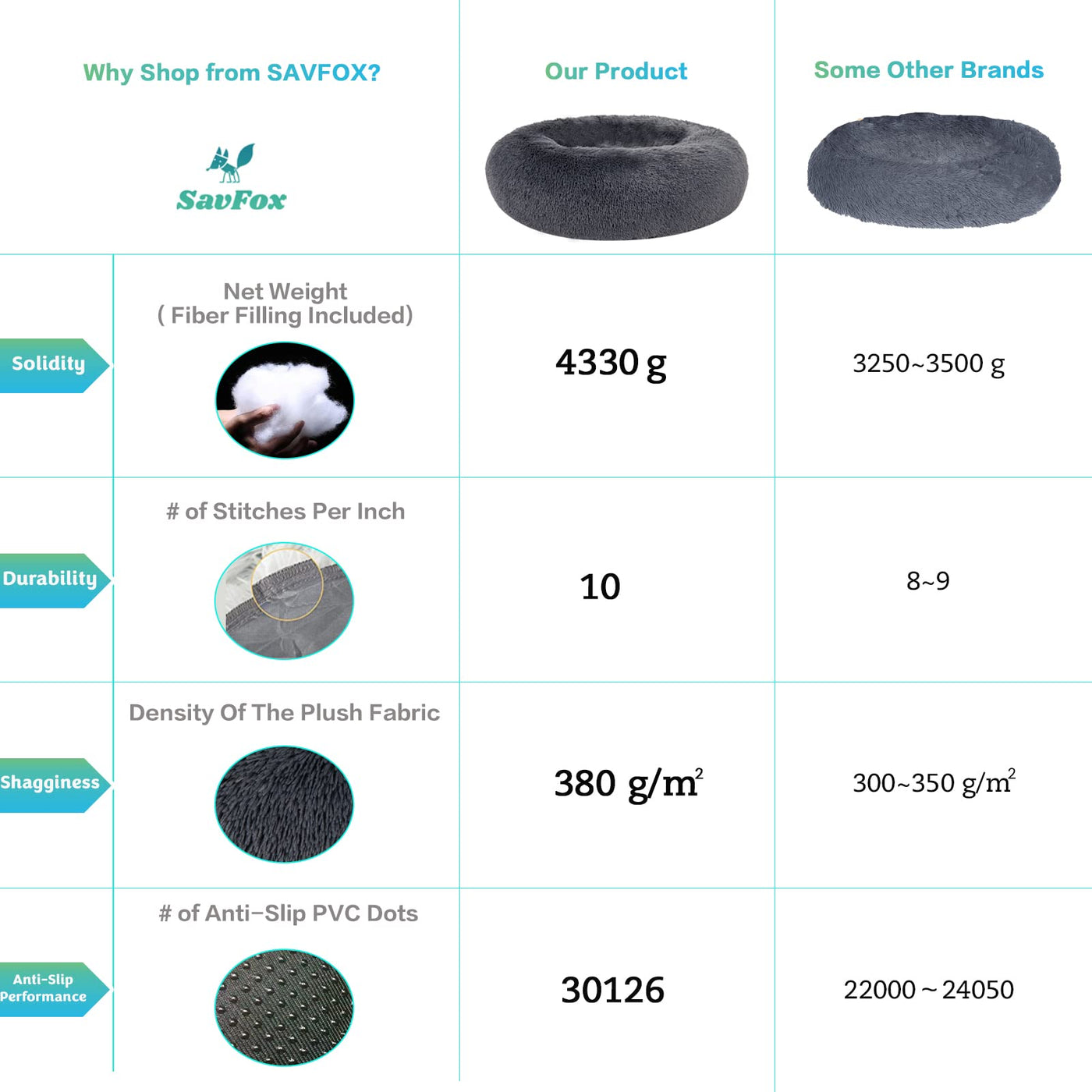 Q: What material is the SAVFOX dog bed made of?A: The SAVFOX dog bed is made of soft faux fur material, providing a plush and comfortable resting spot for your pet.