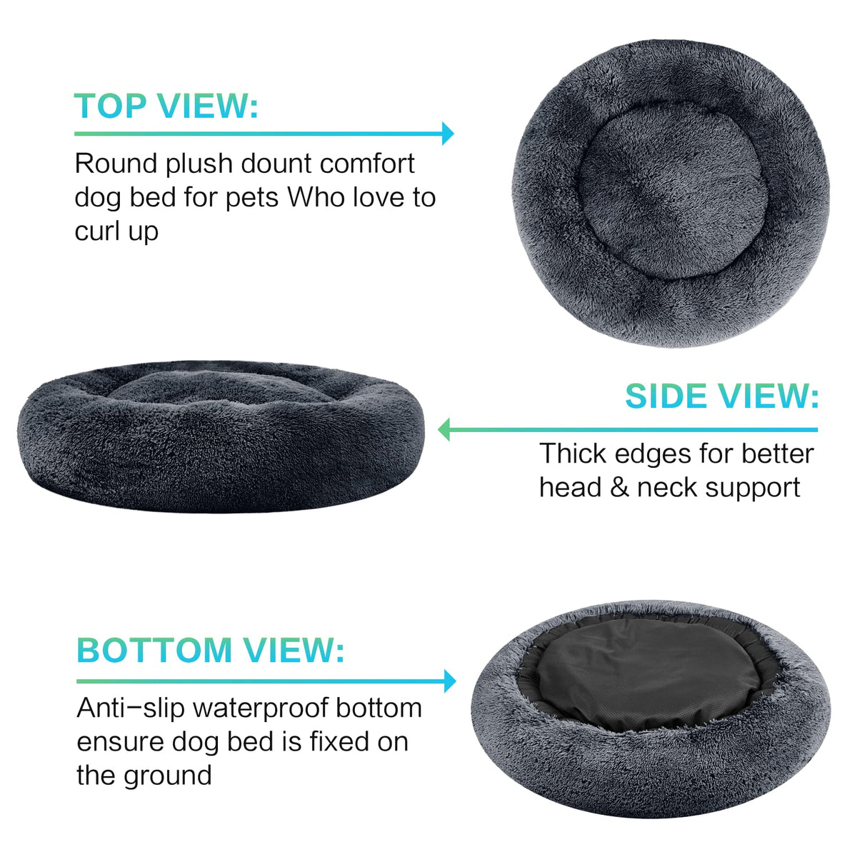 Buy With confidence - 90 Day Money Back guarantee: Include a 1-year warranty plus the No Questions Asked 90-day money-back return policy If you have any questions about the pet bed simply reach out to our customer service team All your issues will be friendly & swiftly resolved within 24 hours Better Than Most Pet Beds On The Market: Look for a quality pet bed to help eliminate your pets suffering from anxiety when sleeping No need to struggle with cheap flimsy donut pet bed This donut bed is built with durable much thicker plush faux fur exterior and premium high quality fibers to keep shape up to 3X longer than others Knitted and fabricated in top-notch manufacturer which is the same outsourcer of the most popular original calming bed brand as seen everywhere Supports Better Sleep: Ideal for pets to twist up or sprawl paired with profound crevices the raised rim around provides warmth with a sense of security it helps them to calm down faster ease anxiety and sleep well It also provides excellent support for the head and neck and relieves joint and muscle pain Warm & cozy: great engineered synthetic plush fur a blend of comfortable and breathable full stuffing to guarantee your little furry friend surrounded by love & warmth a perfect gift in the cold winter days Non-slip & Easy care: Pet bed has been designed with a non-slip base which can be easily fixed on the tile and hardwood floor of the home Its versatile design can be seamlessly added to the decoration of any room Hand wash or simply machine wash and dryer -- Machine wash gentle cycle Tumble dry low heat Please pat to make the dog bed completely fluffy before use