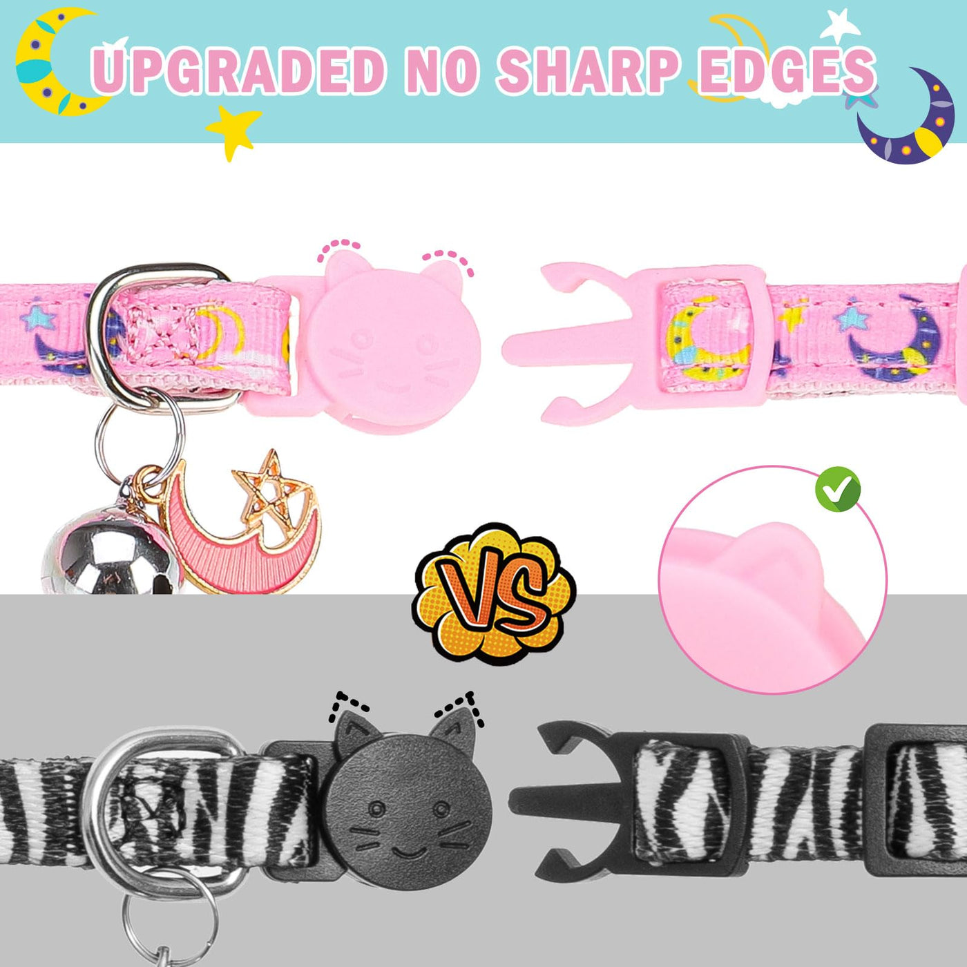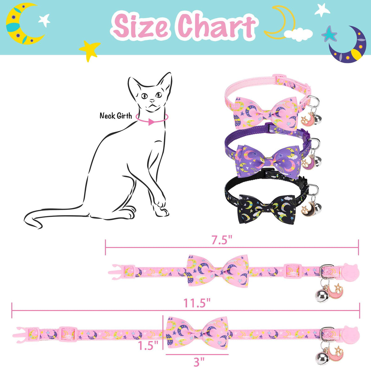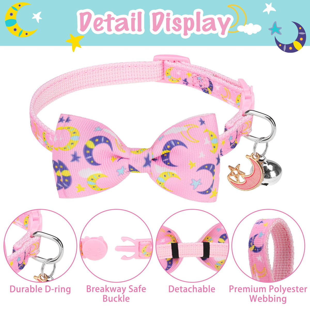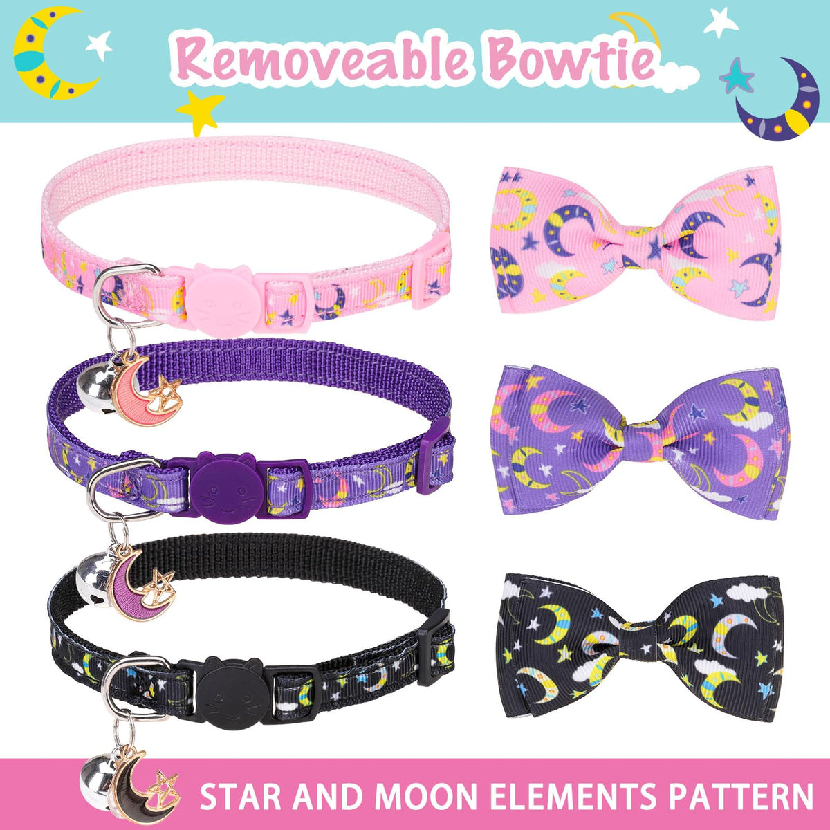 Scenereal Cat Collar Breakaway 3 Pack - Safety Kitten Collar With Bells Moons Stars Bowtie, Spring Summer Pet Accessory For For