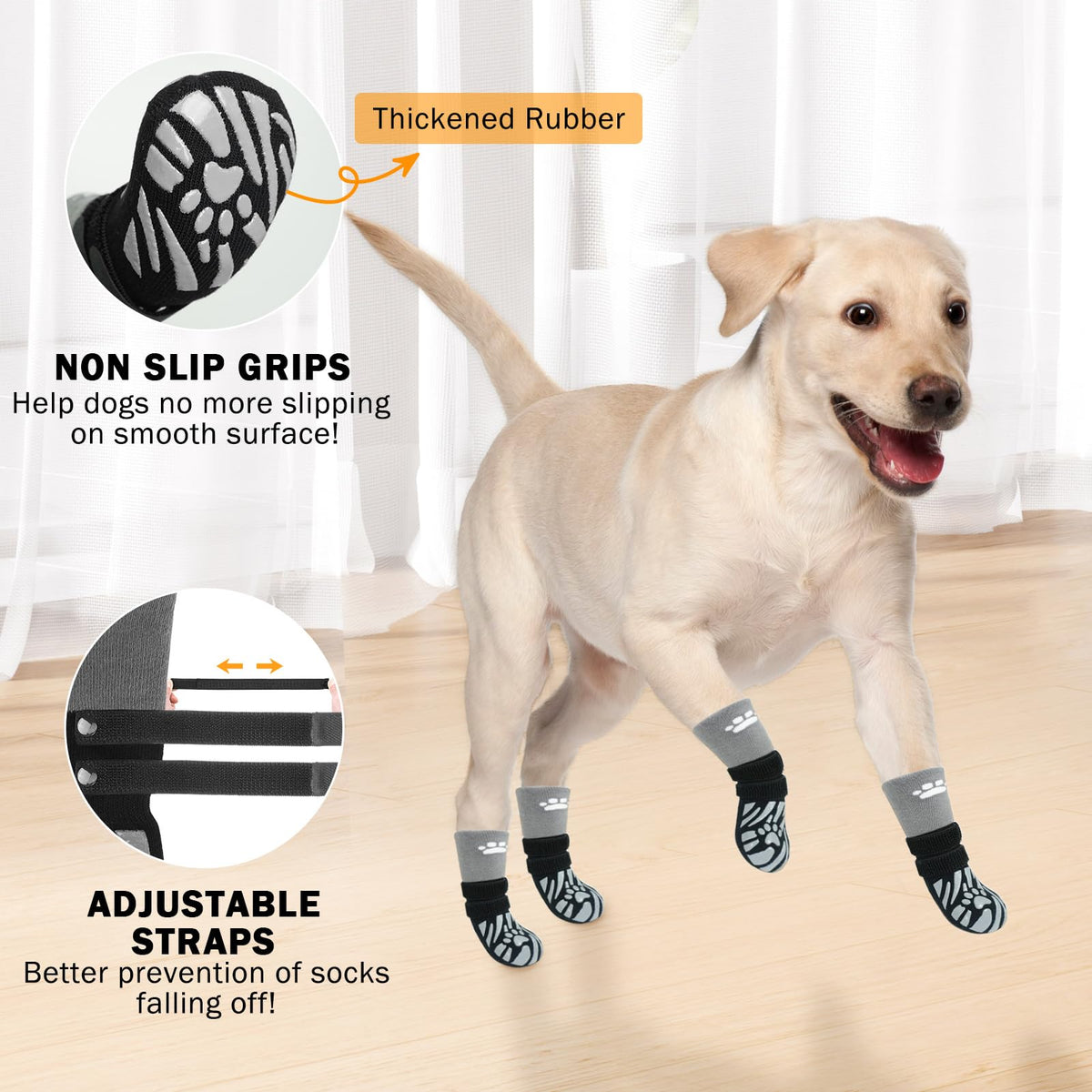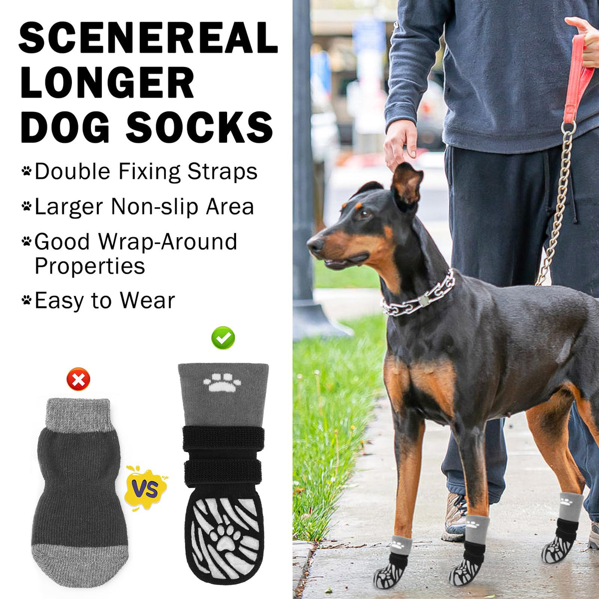 The Scenereal Dog Socks For Wounds Are Designed For Older Dogs To Provide Traction And Help Them Regain Their Confidence In Standing. Both Sides Of The Dog Traction Socks For Senior Dogs Are Designed With Large Non-Slip Rubber, So When One Side Wears Out, You Can Switch Sides And Continue To Wear Them For Your Dog. Your Dog Will Be Able To Stand Firmly Even When The Grippy Dog Socks Are Twisted. And The Shape Is Aesthetically Pleasing While Remaining Practical. The Grippers Non Slip Dog Socks Are Designed With A Footprint Print On Both The Inside And Outside Of The Sock And Look Great Folded And Worn. The Double Strap Design Reduces The Risk Of Slipping, And Of Course You Can Choose To Wear One Or Two Fastening Straps As Required.