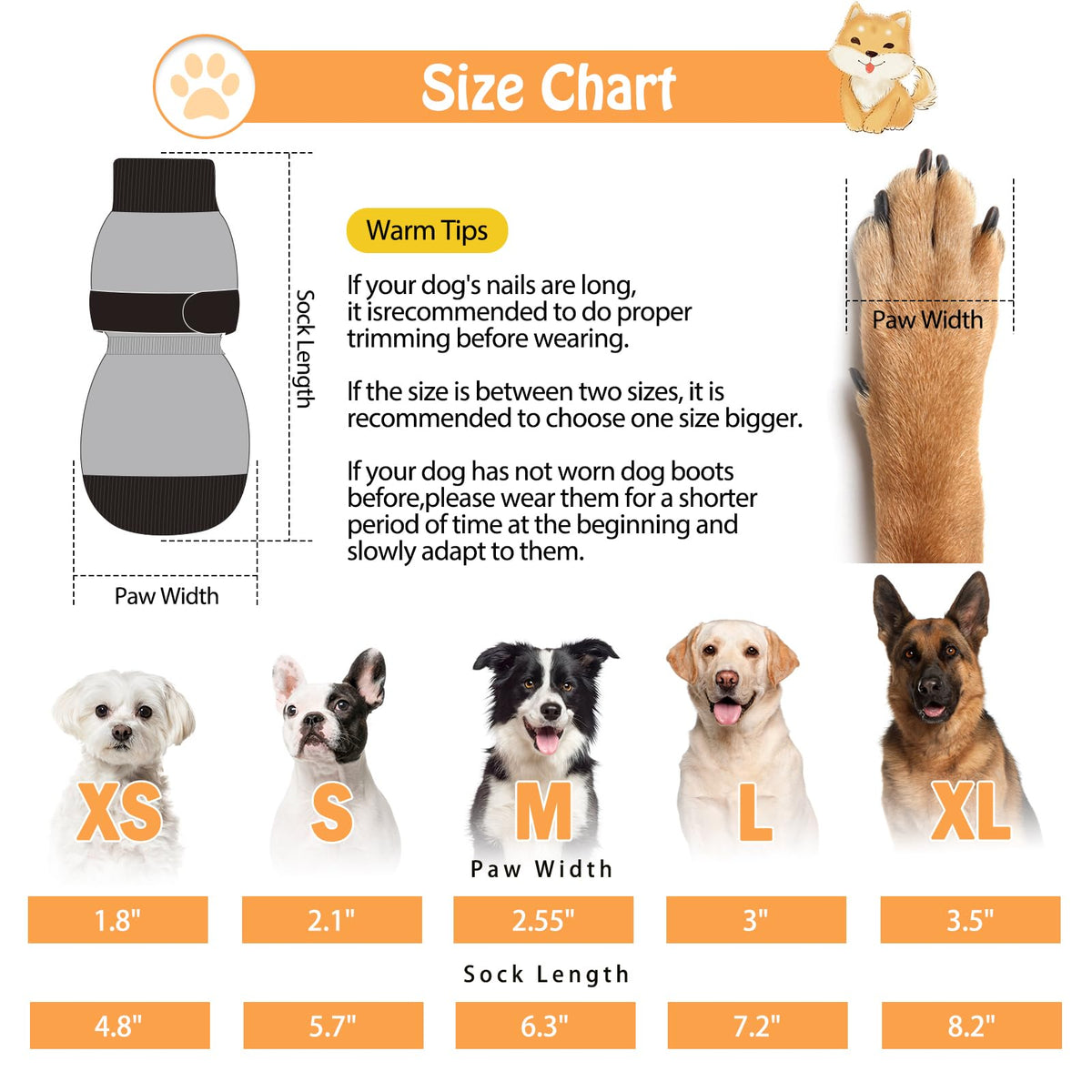 Size S: Paw Width 2.1in Sock Length 5.7in. To make your dog comfortable to wear please measure your dog 's paw size according to the measurements we provide