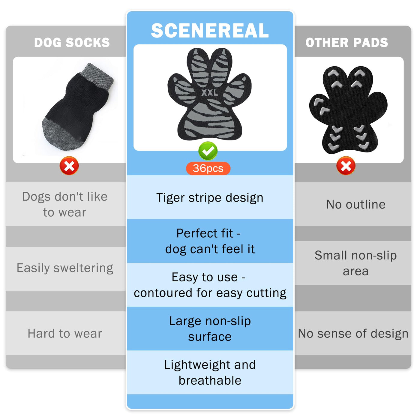 The Dog Paw Pad Protector Come With Non-Slip Rubber On The Bottom To Help Senior Dogs Stand And Walk More Easily On Hardwood Floors Or Any Smooth Surface. Compared To Dog Boots And Socks, Scenereal Dog Paw Strips Are Ultra Thin And Fit The Foot So Perfectly That Your Dog Won'T Even Feel Them. Detailed Instructions Are Included, Please Follow The Instructions. The Dog Paw Protector Keeps Your Dog'S Paws Dry, Warm, Clean And Safe. No More Wiping Muddy Or Sandy Paws After Rain Or Snow; Preventing Paw Injuries From Sharp Objects; Helping Your Dog Move Freely And Stay Stable When Walking On Cold, Hard Tile And Hardwood Floors In The Winter And Getting Burned On Hot Sidewalks In The Summer. The Scenereal Paw Pads Can Be Divided Into 5 Pieces Or You Can Just Stick The Whole Pad On. You Can Use It Easily. Tips: Wet Water Makes It Easier To Peel Off The Dog Paw Pads. 9 Sets Of 36 Pieces Make It Easy To Replace The Pads. Paw Pads Usually Need To Be Replaced Every 2-5 Days. What Should We Do Before Applying The Paw Patches? (1) Trim Your Dog'S Nails And The Hair Between The Toes; (2) Wash And Keep Your Dog'S Feet Dry. Note: Although Our Dog Toe Protectors Have Excellent Adhesion, The Adhesion May Be Reduced When Your Pet'S Feet Are Wet.