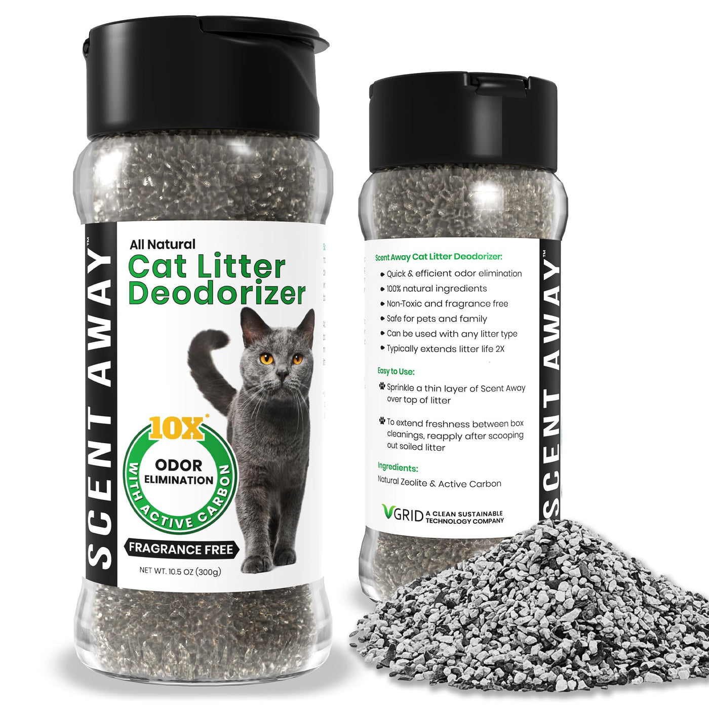 Q: How does Scent Away Cat Litter Deodorizer eliminate odors?A: Scent Away Cat Litter Deodorizer uses active carbon to absorb and trap unwanted odors, making it an effective odor eliminator for your litter box. The porous surface of active carbon has a large area that helps in neutralizing smells, ensuring your home stays fresh.