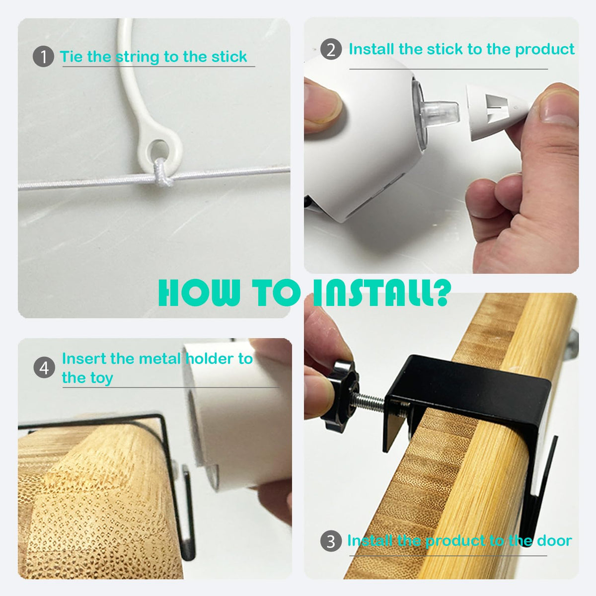 The Aukl Cat Toy Hangs On The Door And Automatically Rotates The Feathers To Simulate The Movements Of A Manually Interacting Cat. Runs For 10 Minutes And Switches Off Automatically Automatic Door Frame Cat Toy Will Restart Play After 2 Hours On Standby. Shake And Twirl The Tail To Entice Your Baby To Chase The Flying Feathers, And The Elasticated Cord Adds To The Fun. Exercise Your Cat At Home Choose Between Slow And Fast Speeds And Simply Change Modes With The Power Button. The Different Speeds Are Suitable For Shy Kittens Or Active Adult Cats. Slow Mode Is Recommended For The First Trial Rechargeable Cat Toy Will Be Fully Charged In 2-3 Hours. Programming The Toy To Work For 5 Minutes And Standby For 120 Minutes Will Help Kittens To Rest After Exercise. Iron Plate Mounted On The Door, Stronger Than Suctio Cups. Whether Your Door Is Open And Closed. Kittens Can Be Entertained With Aukl Cat Toys Hanging From The Door. See Pictures On How To Install Package Comes With 2 Small Feathers And Bell, Add Any Accessories If Desired. Excessively Heavy Tail Will Slow Down The Rolling Speed. Manufacturer Support - 12 Month Warranty And 24 Hour Online Service Translated With Deepl.Com (Free Version)