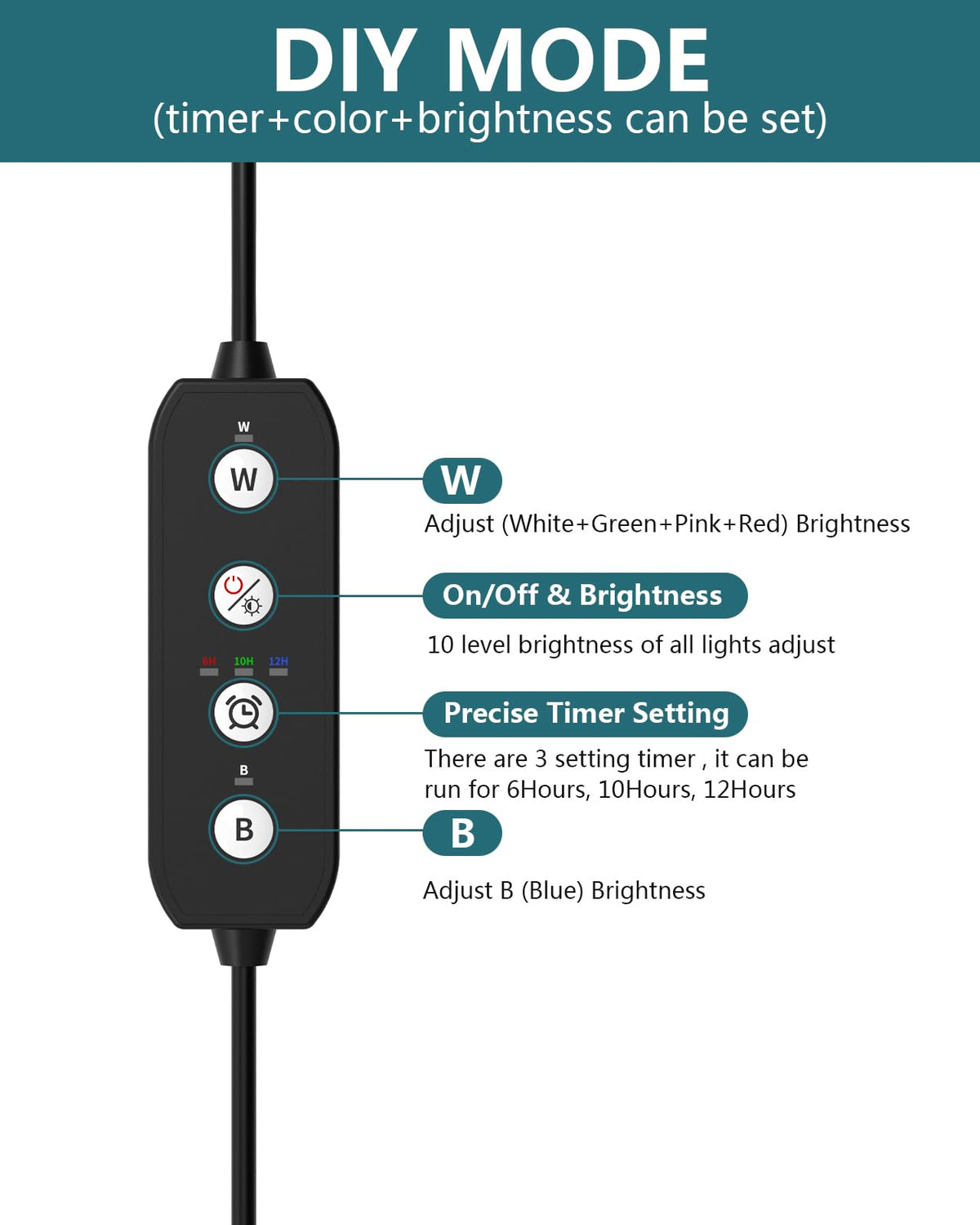 ?[DIY MODE] :Time Colour and Brightness 3 setting choose. Timing (Timer control key): 3 choices timer running for 6 hours or 10 hours or 12 hours; Brightness/On-Off key: 10 level brightness and Switch function. Colour(W/B key): 3 colour modes choose All lights on White/Red/Green/Pink Only Blue