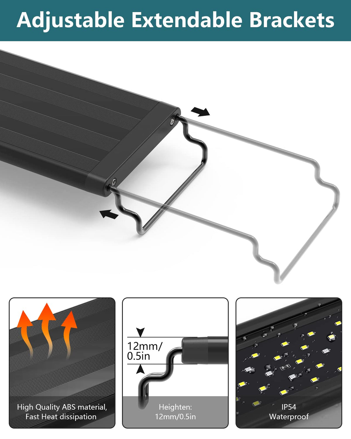 ?[5 columns of Led Chips Extendable Metal Bracket]: Compared with other tank lights up to 5 columns of led chips they are more compact and beautiful. Good heat dissipation of the ABS shell. Use the stable and durable metal bracket adjustable extendable bracket fit for most gallon tanks