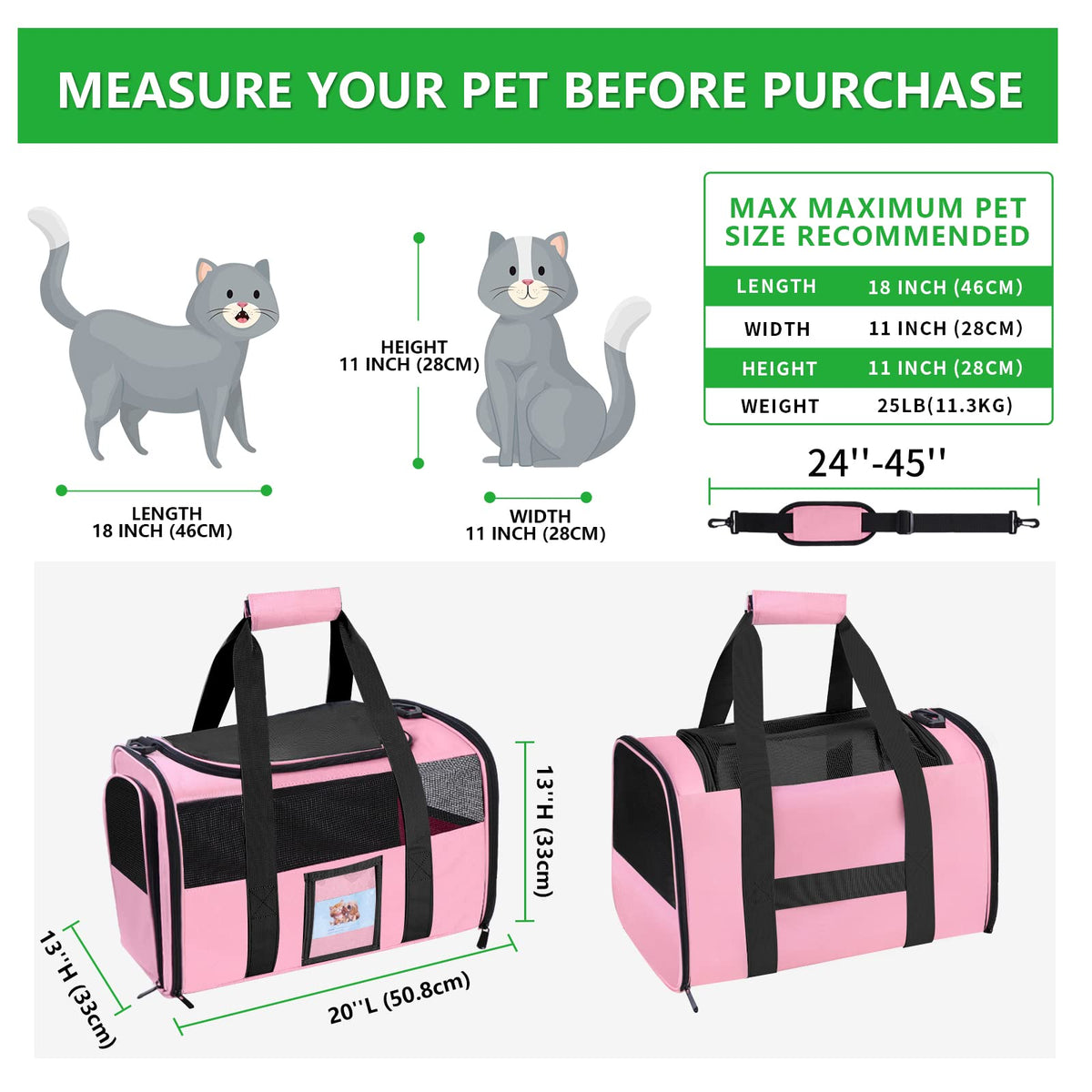 Size Of Our Pet Carrier: 20In(L)*13In(W)*13In(H) And Weight :2.6 Lb. We Recommended That The Pet Size You Carried Are Within 18In*12In*12In And Weigh Less Than 25Lb(11.34Kg), In Order To Give Your Pet More Comfortable Feeling.