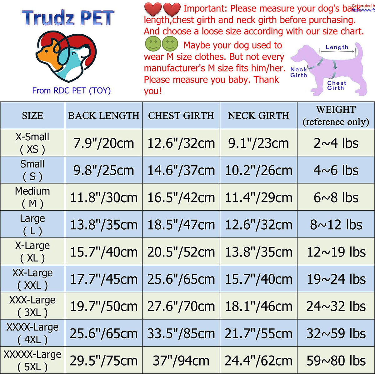 Trudz Pet ( Rdc Pet ) —— Your Pet's Ever This Dog hoodie is made of Breathable & Soft cotton/polyester fabric, and blend soft fleece interior makes your dog have a warm autumn and winter. Easy-care,machine washable for this pet hoodies. Classic & Fashion 'Security' Pattern style makes your dog more funny, like a police in bulletproof vest. More Lovely, More Clever and Cute,more Pleasantly warm, Just for your pet. Various choice of sizes, Mainly for small dogs, medium dogs and large dogs. Please don't choose size according to a usual size, but to measure your pet's neck girth, chest girth and back length ( especially the chest girth ) and choose the correct size according to our size chart. If your pet is growing, please choose a larger size. Size Chart: XS-- Back length: 7.9 inch ( 20 cm ), Chest girth: 12.6 inch ( 32 cm ), Neck girth: 9.1 inch ( 23 cm ) S-- Back length: 9.8 inch ( 25 cm ), Chest girth: 14.6 inch ( 37 cm ), Neck girth: 10.2 inch ( 26 cm ) M-- Back length: 11.8 inch ( 30 cm ), Chest girth: 16.5 inch ( 42 cm ), Neck girth: 11.4 inch ( 29 cm ) L-- Back length: 13.8 inch ( 35 cm ), Chest girth: 18.5 inch ( 47 cm ), Neck girth: 12.6 inch ( 32 cm ) XL-- Back length: 15.7 inch ( 40 cm ), Chest girth: 20.5 inch ( 52 cm ), Neck girth: 13.8 inch ( 35 cm ) XXL-- Back length: 17.7 inch ( 45 cm ), Chest girth: 25.6 inch ( 65 cm ), Neck girth: 15.7 inch ( 40 cm ) XXXL-- Back length: 19.7 inch ( 50 cm ), Chest girth: 27.6 inch ( 70 cm ), Neck girth: 18.1 inch ( 46 cm ) XXXXL-- Back length: 25.6 inch ( 65 cm ), Chest girth: 33.5 inch ( 85 cm ), Neck girth: 21.7 inch ( 55 cm ) XXXXXL-- Back length: 29.5 inch ( 75 cm ), Chest girth: 37 inch ( 94 cm ), Neck girth: 24.4 inch ( 62 cm )