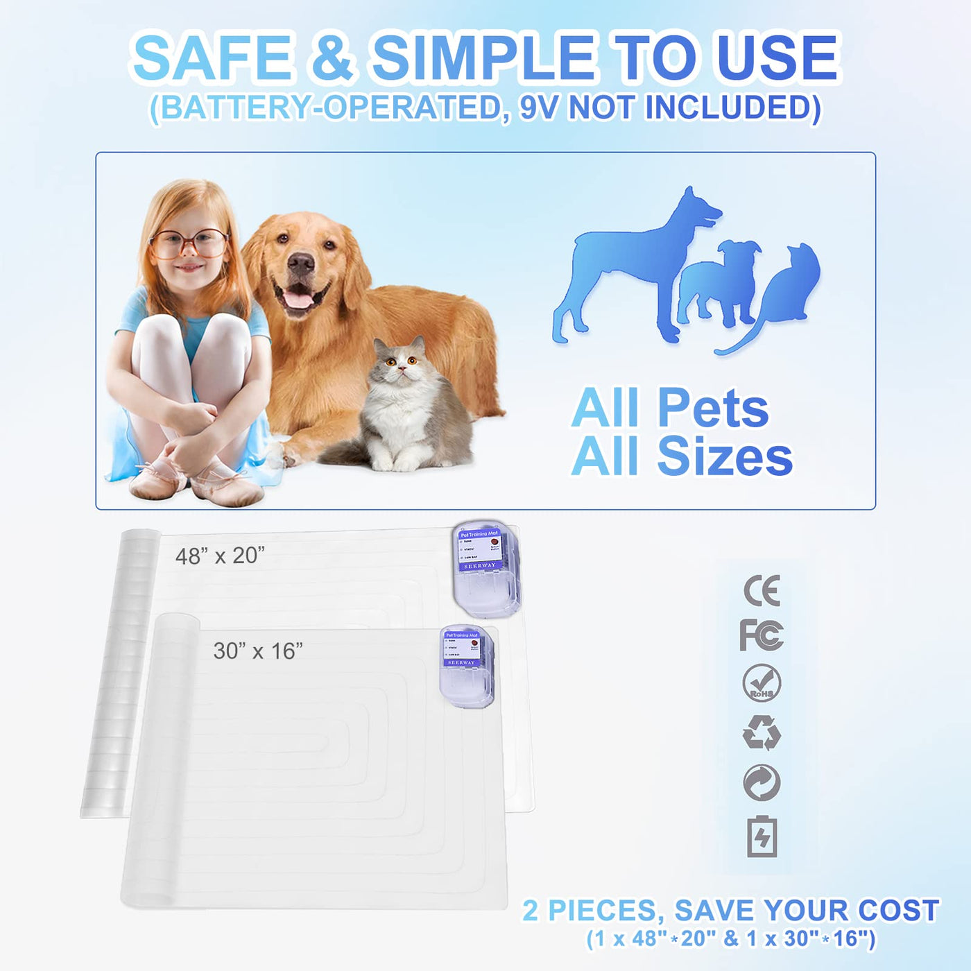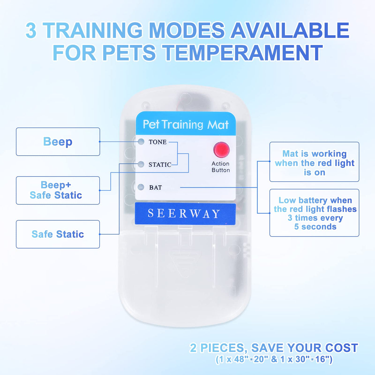 *Seerway Pet Training Shock Mat For People To Have Happier Time With Pets, 2 Pieces In Different Size In One Box To Save Your Cost. Our Pet Shock Mat Can Keep Your Pets Off Prohibited Areas Safely And Effectively. *3 Training Modes Of Seerway Pet Training Mat: Tone: Training Mode With Beef Sound And Low-Power Electronic Pulse. Tone+Static: Training Mode With Harmless & Low-Power Electronic Shock, You Will Hear A Beep Sound. Static: Training Mode With Harmless & Low-Power Electronic Shock, No Beep Sound. *How To Get It Work: 1. Momentarily Press And Release The Red Button To Switch On, Wait 1 Minute For Calibration. 2. Momentarily Press And Release The Red Button To Change Work Mode After The Mat Is Switched On. 3. Press And Hold The Red Button For 3 Seconds To Switch Off. *Note For Users: 1. Too Much Fur On Pet'S Paw Might Cause The Mat Not To Trigger, Trim Excess Fur For Pets Before Training Starts. 2. The Training Mat Needs Calibration For 1 Minute Itself After It Is Switched On, Any Movement During Calibration May Cause The Mat To Work Improperly. 3. Switch Off The Mat If You Need To Change Battery Or Place It On Another Working Location. 4.Please Read The Safety Information And Direction Below Before Use. *What You Will Get: 2 X Seerway Pet Training Mats In Different Size(No Plastic Bag For Package For Environmental Protection). 1 X User Manual. *Guarantee & Service: Any Missing Or Defective Part, A New One Will Be Sent As Replacement. Seerway Service Team Is Ready To Reply Within 12 Hours, Please Feel Free To Contact Us If There Is Any Question.